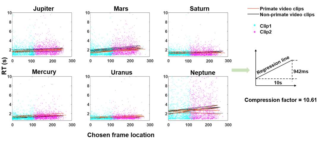 此外,由于猕猴在试次中反应时都显著短于视频本身,研究人员计算了猕猴选择视频中第一帧图片和最后一帧图片的平均反应时,两者之间的平均差值为942毫秒(六只猕猴的范围:468-1859毫秒),该回放速度相当于每一秒的视频只需要94.2毫秒进行回放,因此平均压缩指数(compression factor)为10.61(见图二)。