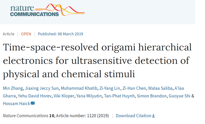 《自然·通讯》(Nature Communications)杂志于2019年3月8日在线发表了由我院青年教师张闽副教授和以色列理工学院Hossam Haick教授合作研究的最新成果—“时空分辨折纸递阶型电子器件应用于超灵敏检测物理和化学刺激”(Time-Space-Resolved Origami Hierarchical Electronics for Ultrasensitive Detection of Physical and Chemical Stimuli)。张闽副教授为论文第一作者,以色列理工学院Hossam Haick教授为通讯作者。我院施国跃教授、2017级分析化学硕士研究生林子杨和2015级本科生陈子晗共同参与了这项工作。