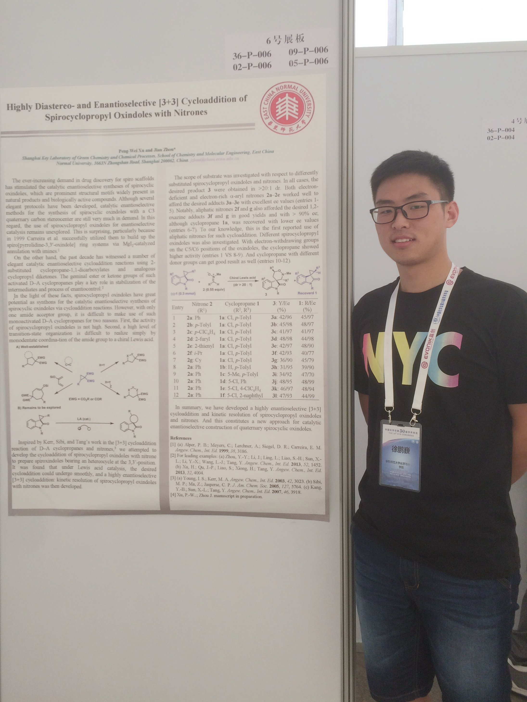 “科研”这个关键词,贯穿了他五年的学习生涯。在导师周剑教授课题组里,他致力于发展简单酮硝酮参与的不对称催化反应,以发展新的氮杂四取代碳手性中心构建方法,以第一作者的身份发表了三篇SCI论文,其中“Diastereo- and enantioselective [3 + 3] cycloaddition ofspirocyclopropyl oxindoles using both aldonitrones and ketonitrones”发表在《自然•通讯》(Nature Communications),影响因子高达12.353。