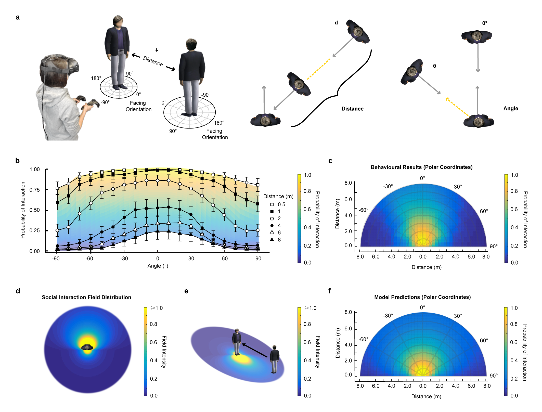 研究团队使用3D引擎编程,实现了虚拟人物之间的距离和角度的操控,定量化地测量了人类之间的社会交互强度。具体而言,实验对象在使用虚拟现实设备,调控两个虚拟人物的距离、角度的过程中,产生的数据可以作为判断其交互行为的指标。