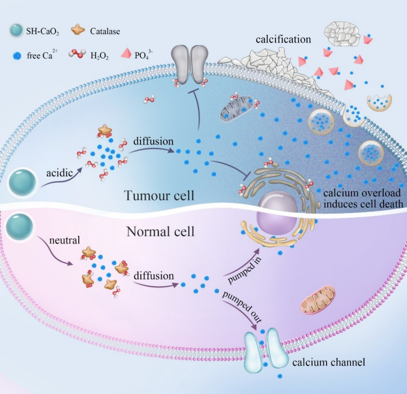 基于以上考虑,该合作研究团队采用一种简单的湿化学法,巧妙设计合成了一类粒径小于5nm的CaO2纳米颗粒,并在其表面包覆一层透明质酸钠,得到了超小SH-CaO2纳米颗粒。在肿瘤病灶区中,SH-CaO2表面的保护层被透明质酸酶分解,暴露出的CaO2在肿瘤酸性微环境中可以加速分解,快速产生过氧化氢和游离Ca2+。由于肿瘤细胞中的过氧化氢酶表达下调,导致由CaO2分解产生的过氧化氢在肿瘤细胞内大量累积,诱发肿瘤细胞产生氧化应激,氧化应激进一步导致Ca相关的离子通道的功能障碍,无法正常调控肿瘤细胞内Ca2+浓度,从而造成由过氧化钙分解释放的Ca2+在肿瘤细胞内长时间滞留,这种异常的Ca2+聚集行为将引发持续性的细胞钙超载,干扰或阻碍肿瘤细胞的代谢和增殖过程,诱导肿瘤细胞代谢紊乱以及功能性失调,从而诱导细胞死亡;同时,Ca2+的局部富集还能促进肿瘤病灶区的钙化发展。这类由超小过氧化钙纳米颗粒诱发的肿瘤细胞死亡方式,在该研究工作中被定义为“钙死亡”(Calcicoptosis)。