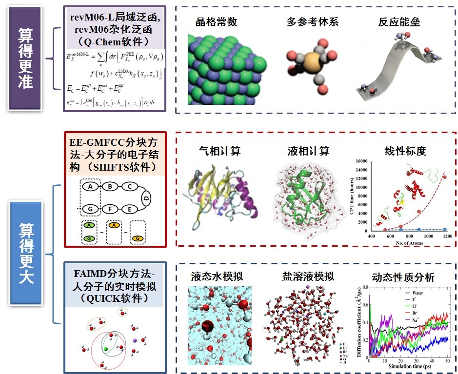 何晓研究员近年来围绕理论化学“算得更准”和“算得更大”的核心科学问题,主要致力于分块量子化学方法和高精度密度泛函的发展与应用,并在此基础上开展了系列的应用研究并取得了系列创新性成果:第一,通过发展精确的大分子区域化分块量子化学方法,引入量子多体相互作用和环境极化效应将大分子的量子总能量计算降为线性标度,并且与全体系的计算结果高度吻合;率先将分块量子化学方法应用于周期性体系的红外、拉曼光谱和生物大分子的核磁共振波谱(NMR)的模拟,开发了基于第一性原理计算生物大分子核磁共振波谱的AF-NMR软件,并被诸多实验课题组广泛使用,何晓研究员提出的分块量子化学方法可以很容易的实现大规模并行计算,并且计算不受体系大小的限制,可以适用于包含几十万个原子体系的第一性原理计算,突破了传统量子化学方法的局限。第二,将分块量子化学方法与分子动力学模拟结合,首先实现了在耦合簇理论水平上的复杂大分子体系的从头算分子动力学模拟,精确给出了液态水和盐溶液内分子间的动态氢键作用网络和微观结构,首次验证了实验上提出的液态水中水分子以超低配位数的环链式结构与四面体结构并存的混合状态存在形式,颠覆了液态水以水分子构建的四面体结构存在为主的传统观念。第三,提出了新的可同时适用于化学和凝聚态物理体系的高精度局域密度泛函revM06-L和MN15-L(ESI 1%高被引论文),和适用于含主族元素和过渡金属等分子体系精确计算的全局杂化泛函revM06和MN15(ESI 1%高被引论文),这些新的密度泛函已被诸多研究小组广泛使用。上述工作为定量研究复杂大分子体系的新颖量子性质、水溶液中分子间相互作用动力学的量子机制,以及精确预测大分子和材料体系的性质提供了高效而精确的理论新工具。