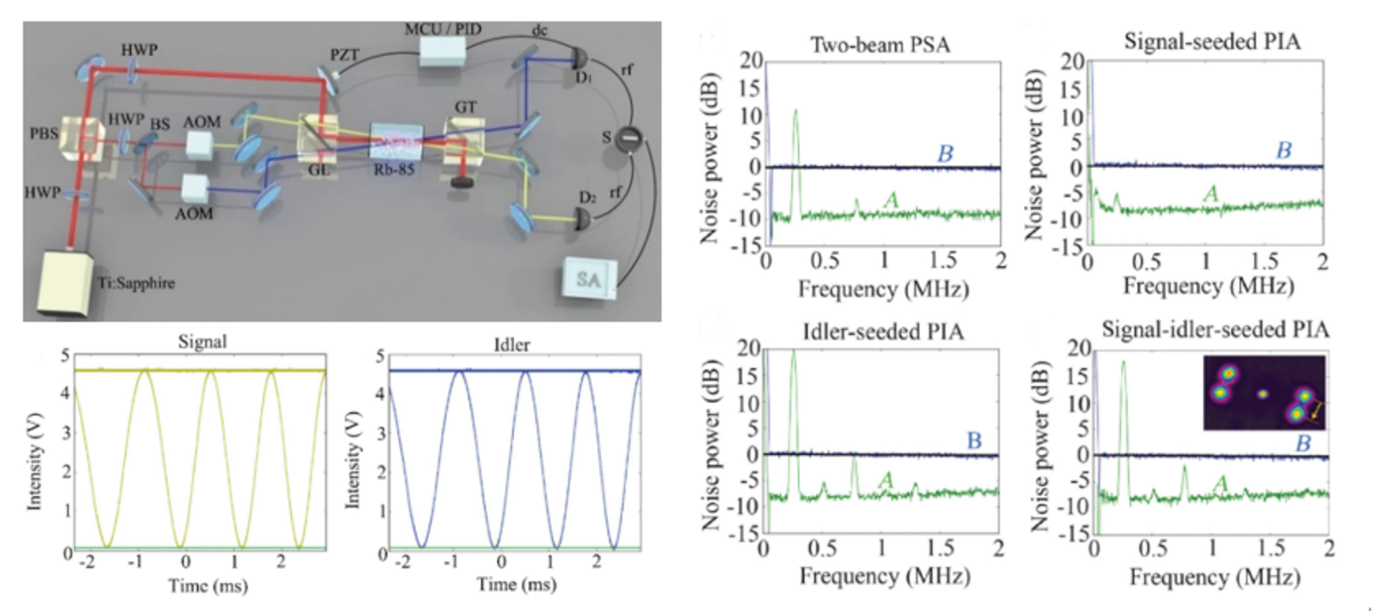 近几年,基于原子系综四波混频过程的非相敏放大器被证明是产生量子压缩的一种非常有效的方法。由该系统产生的量子压缩光束在量子成像、量子纠缠延迟以及非线性干涉仪等领域得到了重要的应用。与此不同,该团队另辟蹊径,在实验上实现了利用相敏放大器中的干涉效应来增强量子压缩的方案。