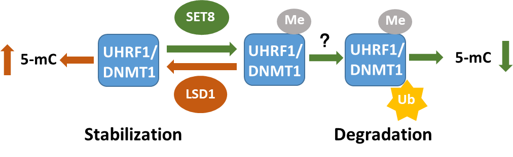 该工作的一大亮点是发现负调控UHRF1/DNMT1活性对于DNA甲基化谱式稳态传承的重要性。虽然DNA甲基化的精准传承离不开DNMT1的维持性甲基化酶活性,但实际上DNMT1也具有一定的起始性甲基化酶活性。因此,DNA甲基化的精准遗传不仅需要严格的维持DNA甲基化的保真度,还需要抑制DNMT1的起始性DNA甲基化活性。由于绝大部分的维持性甲基化都在S期完成,SET8在G2/M期对UHRF1蛋白水平的下调可以抑制DNMT1的起始性DNA甲基化活性, 促进DNA甲基化在遗传过程中的精准性。同时,该工作还证实DNA甲基化对UHRF1蛋白水平的改变比DNMT1更为敏感,UHRF1是一个癌症治疗的重要靶点。