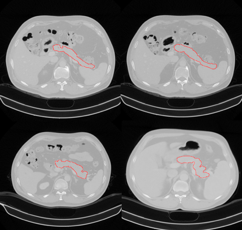此次胰腺CT分割挑战赛,由ISICDM 2018会议组委会联合陆军军医大学数字医学研究所与陆军军医大学西南医院共同主办,旨在通过挑战赛的形式为数字医学产学研界提供技术交流和展示的平台。本项挑战赛收集20例经病理诊断为胰腺癌的病人,40例正常对照组(男性、女性各20例)。扫描设备为西门子64排CT(Definition AS, Siemens),扫描方案为标准胰腺扫描方案,受试者仰卧位躺于扫描床上,扫描范围上包括膈肌,下包括坐骨结节。共采集平扫、动脉期、静脉期三组数据。平扫完成后依据体重经肘静脉推注非离子造剂(欧乃派克350 GE)100-120ml,注射速度为4-5ml/s,注射完成后25-30s采集动脉期,60s采集静脉期。扫描参数为管电压120KV,有效管电流为60-110mAs,准直宽度为16x1.2mm,螺距为0.8,分别行1mm和5mm重建。因胰腺分割在临床上多采用静脉期,所以本次挑战赛仅选取了静脉期图像。