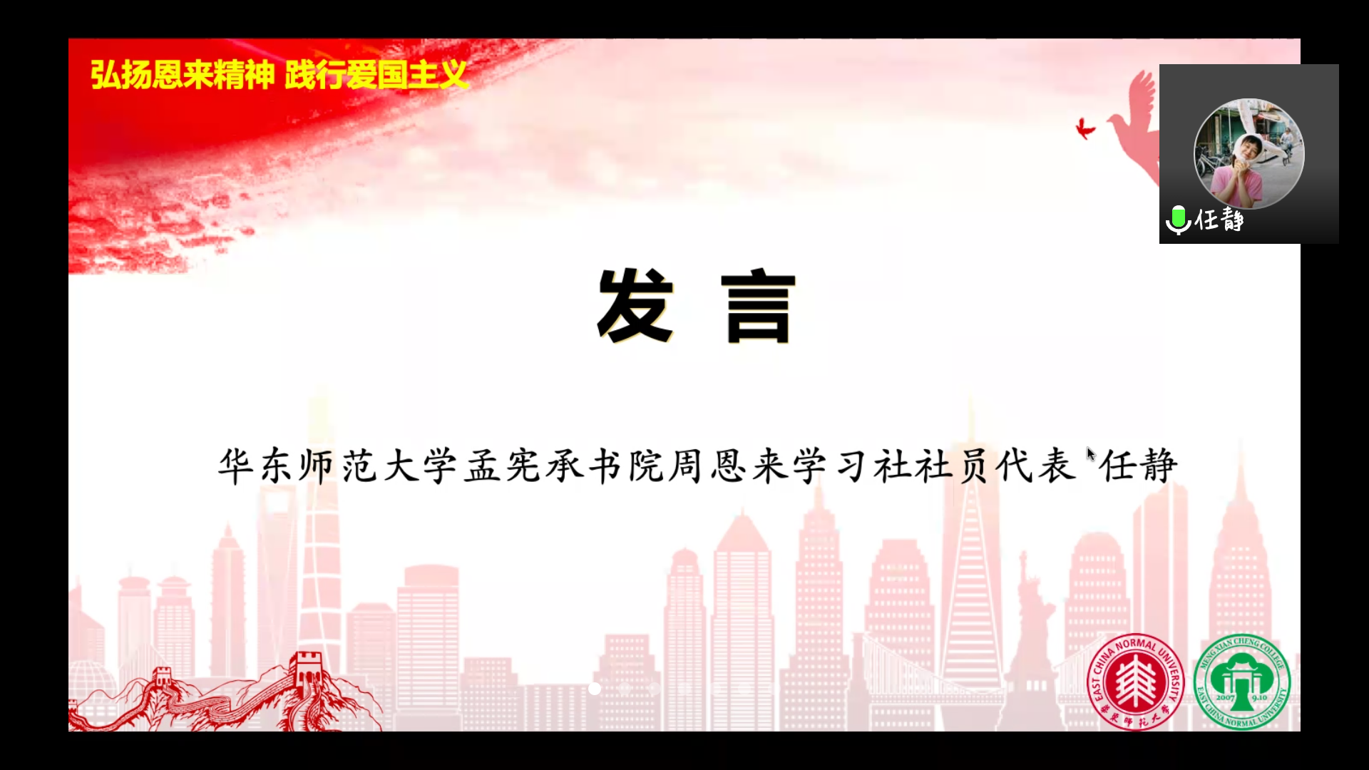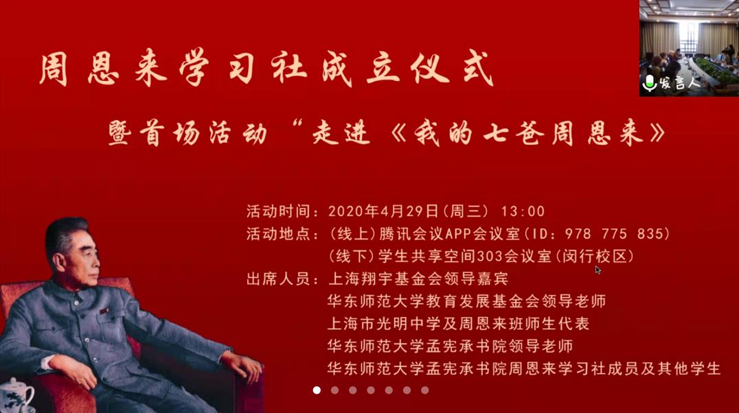 4月29日,在五四青年节到来之际,在上海翔宇公益基金会和3245澳门新莆京教育发展基金会的支持下,3245澳门新莆京孟宪承书院周恩来学习社成立仪式暨首场活动“走进《我的七爸周恩来》”通过线上+线下形式举行。出席本次活动的有上海翔宇公益基金会、上海市光明中学、3245澳门新莆京教育发展基金会及孟宪承书院的领导嘉宾和周恩来学习社成员等,一起见证学习社的成立,共话学习社的未来。