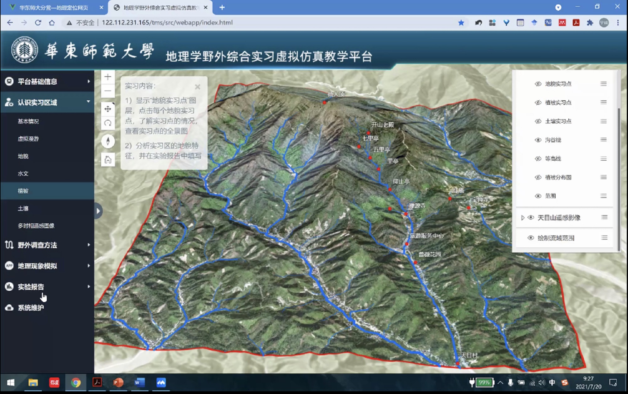 本次科学营还为营员们安排了两场线上与线下相结合的科研实践活动。7月20日,在地理科学学院吴健平教授的带领下,以“探索绿水青山”为主题,营员们开启了自然地理学野外实践。利用地理学野外综合实习虚拟仿真教学平台,营员们系统学习了植被样方调查、土壤剖面观测等相关知识,深入了解了遥感技术、地理信息系统以及全球定位技术的应用,巩固了植被、土壤等地理学基础知识。