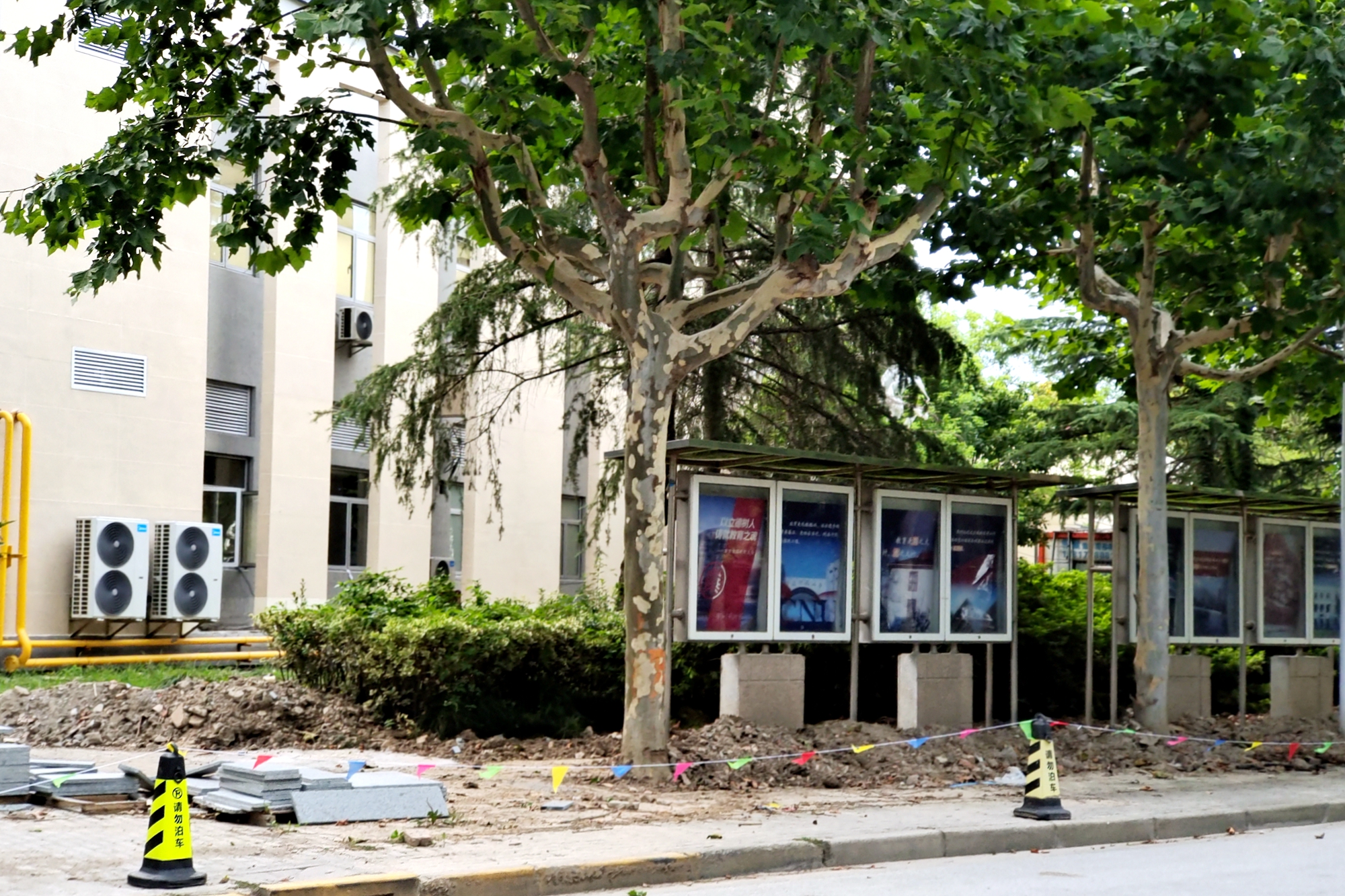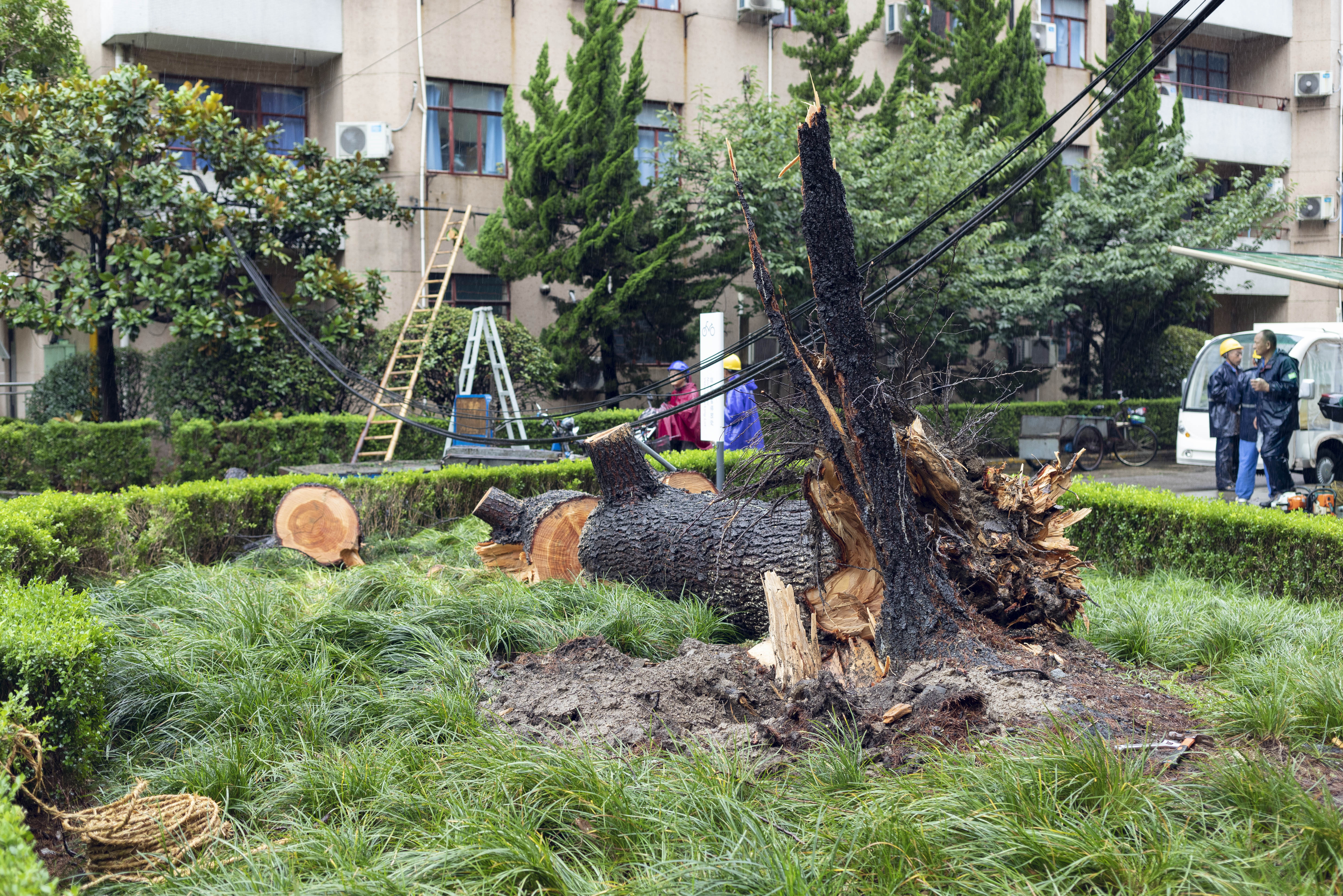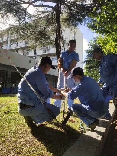 中北校区对外汉语楼与隔壁居民区相邻处,一棵高15米、宽11米的超大构树树枝断裂。倒伏原因:起加固作用的桩移位,钢丝绳断裂。