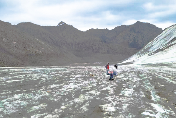 这一次的路程较之前更加困难,同学们需要穿过一段极陡的冰碛物碎石坡、冰冷湿滑的冰川舌区和隐伏冰裂区。师生们克服了艰难险阻安全进入海拔4000m的冰斗区,顶着混合着雪粒冰冷寒风和极寒的温度,挖雪坑、采雪样、钻冰芯,对样品进行了现场的定点、观测、记录和标记保存。
