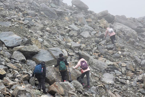上山途中,团队老师对沿途观察到的地质地貌特征等进行了深入讲解。面对起始点就接近3500m的海拔高度,生活在平原的大多数同学都表现出了可见的不适应——呼吸急促、步伐发沉。但凭借着顽强的毅力和良好的团队意识,所有人都顺利到达海拔3850m的天格尔峰纪念碑。