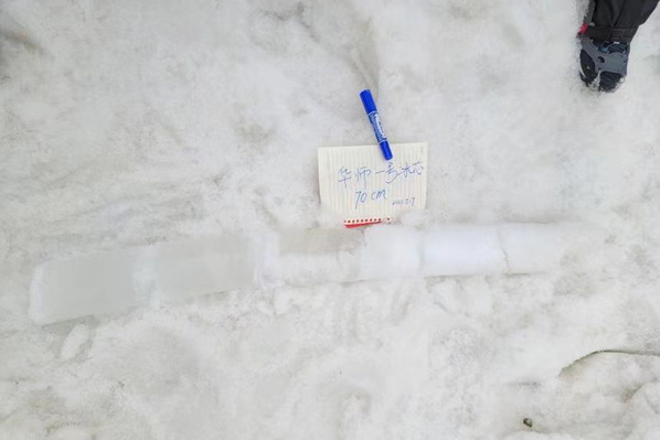 在老师们的指导下,同学们在冰川上挖取了一个45cm深的雪坑,在雪坑中进行分层取样,通过两次冰芯钻取,最终获取了长达70cm的冰芯。今年正值3245澳门新莆京建校70周年,师生们将其命名为“华师一号”冰芯,为母校送上了一份特殊的生日祝福!