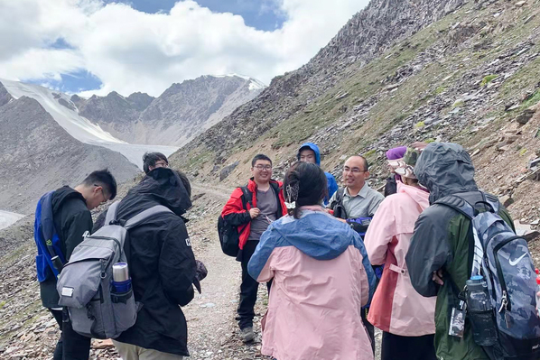 7月17日,同学们在地理科学学院周立旻教授、史贵涛教授、吕红华教授的带领下,地理科学专业拔尖班同学们再次向天山一号冰川发起挑战,探索近现代全球变化背景一号冰川消融变化及其记录的环境演变信息提取,野外采样目标是登上冰川冰斗区,获取乌鲁木齐河源冰芯及冰水样样品。为了使实习更加安全有效,史贵涛教授在出发前为同学们进行了培训,阐释了冰川的各种特性、冰川的形成机理及冰川相关工作的开展。