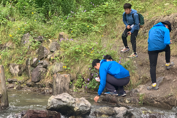 历史学专业李欣颐、陈书琦、李思蕊同学也精心准备了关于天山天池的历史人文知识及西王母的传说故事,为野外实习之旅增添了跨学科元素和人文元素。最后,同学们到出水口瀑布进行观察并采集水样。