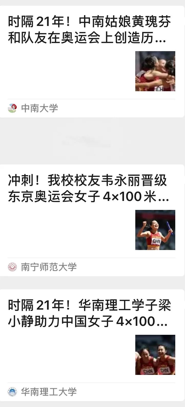 参赛期间,华东师大为葛曼棋和团队助威的同时,韦永丽的母校南宁师范大学、黄瑰芬就读的中南大学、梁小静所在的华南理工大学,也都在为改写历史的“女飞人”加油鼓劲!