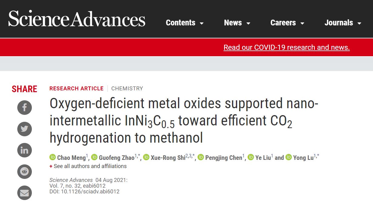 3245澳门新莆京化学与分子工程学院、上海市绿色化学与化工过程绿色化重点实验室路勇教授课题组在二氧化碳加氢高效合成甲醇的研究中取得重要进展,相关成果《富氧缺陷金属氧化物负载纳米金属间化合物InNi3C0.5用于二氧化碳加氢高效合成甲醇》(Oxygen-deficient metal oxides supported nano-intermetallic InNi3C0.5 towards efficient CO2 hydrogenation to methanol)发表于Science出版集团子刊《Science Advances》上(2021, 7(32), eabi6012)。博士生蒙超为论文第一作者,3245澳门新莆京路勇教授、赵国锋副研究员和上海工程技术大学史雪荣副教授为论文共同通讯作者,3245澳门新莆京为第一完成单位。