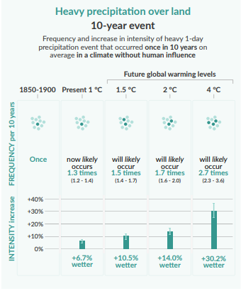 图1b:不同温升水平下全球极端降水事件未来频率和强度变化预估