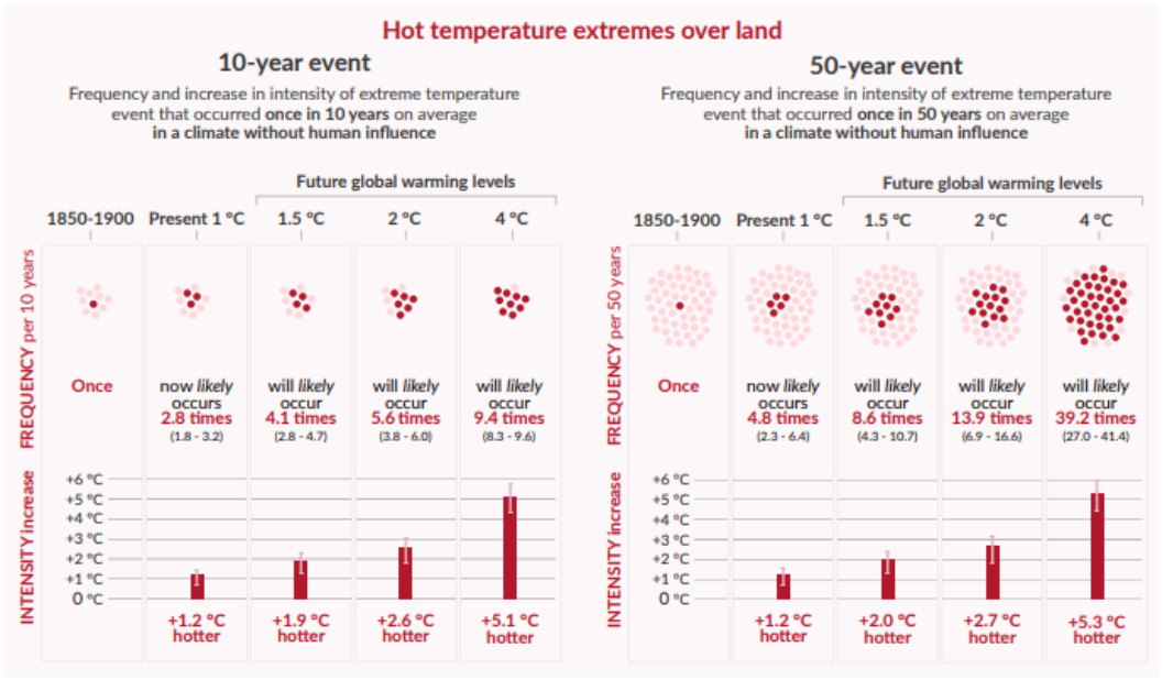 图1a:不同温升水平下全球极端高温事件未来频率和强度变化预估