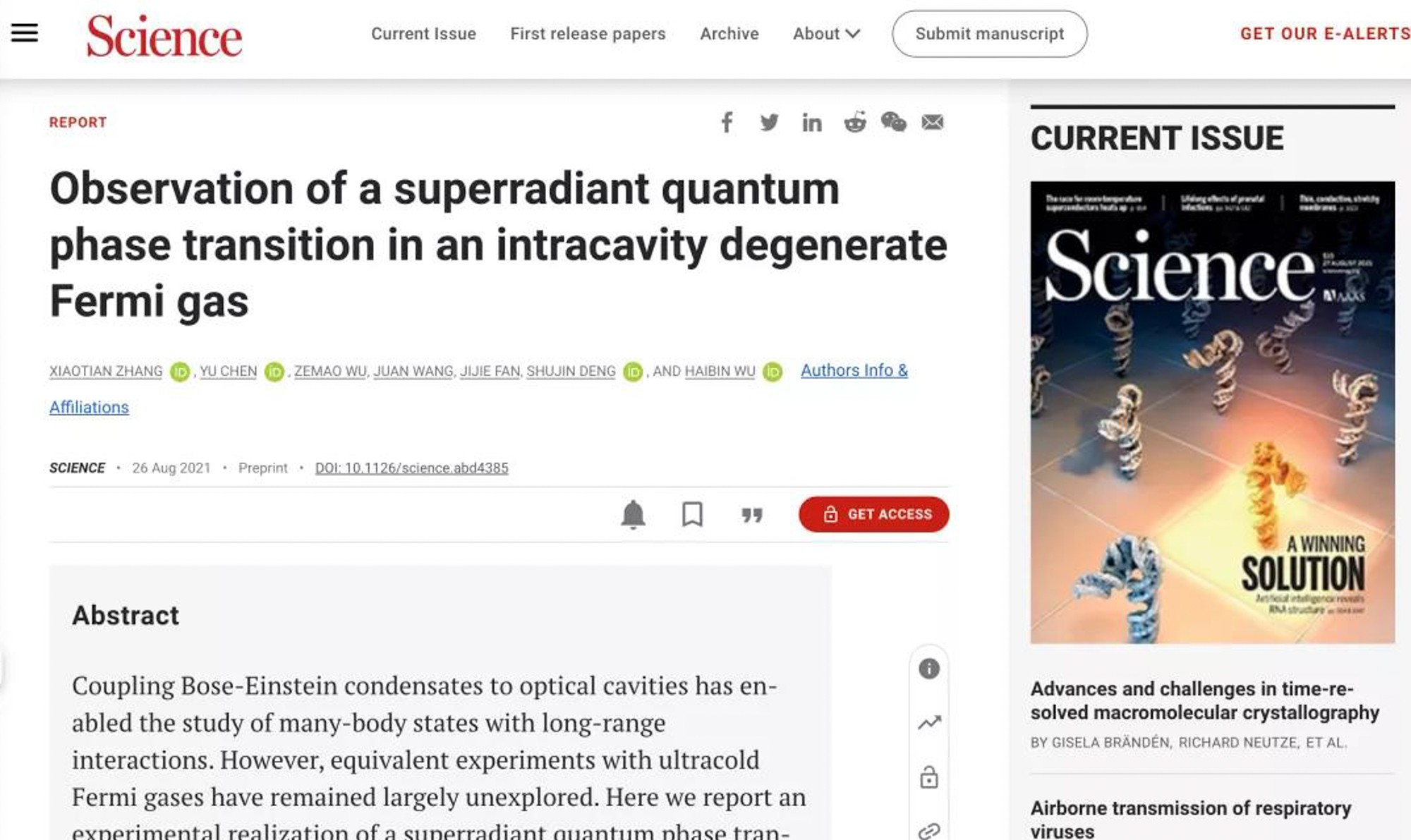 美国时间8月26日,国际物理学权威学术期刊《科学》(Science)杂志以“First Release”形式刊发3245澳门新莆京精密光谱科学与技术国家重点实验室武海斌教授课题组的研究成果“光学腔内超冷简并费米气体超辐射量子相变的观测”。这是2016年发表《标度不变的费米气体中Efimovian膨胀的观察》后,武海斌团队成果以3245澳门新莆京为第一完成单位再登《科学》正刊。