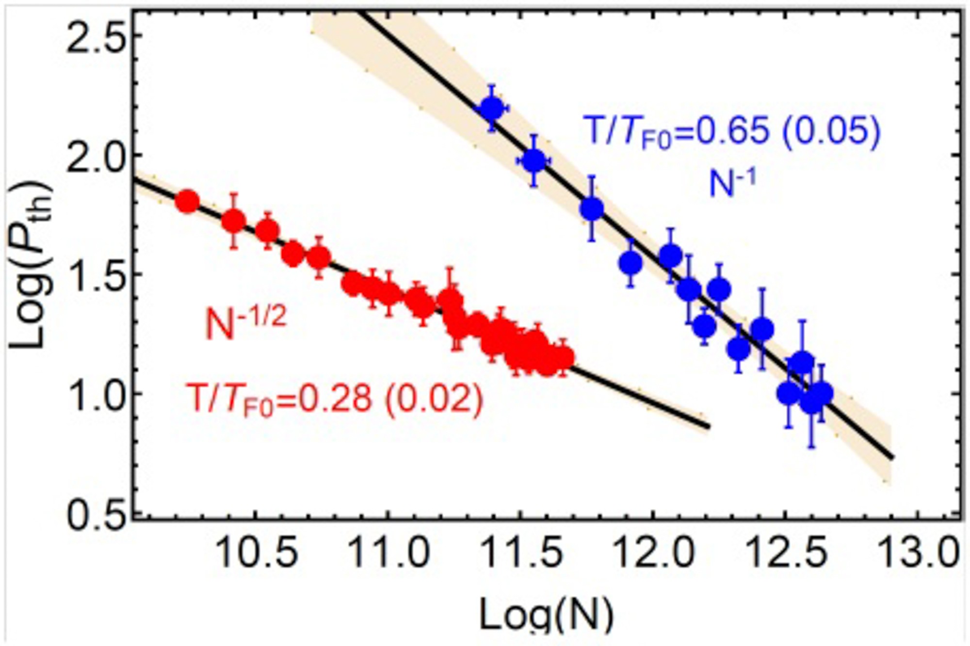 图2:超流量子相变阈值和原子数的标度率。红点和蓝点分别对应于T/TF0=0.28(0.02)和T/TF0=0.65(0.05)的测量数据。括号内表示标准偏差。黑色实线与函数Pth=CN-s的拟合结果,结果低温的标度率为s=0.48(0.02),与理论预测s=1/2相吻合;高温的标度率为s=0.97(0.04),接近N-1。