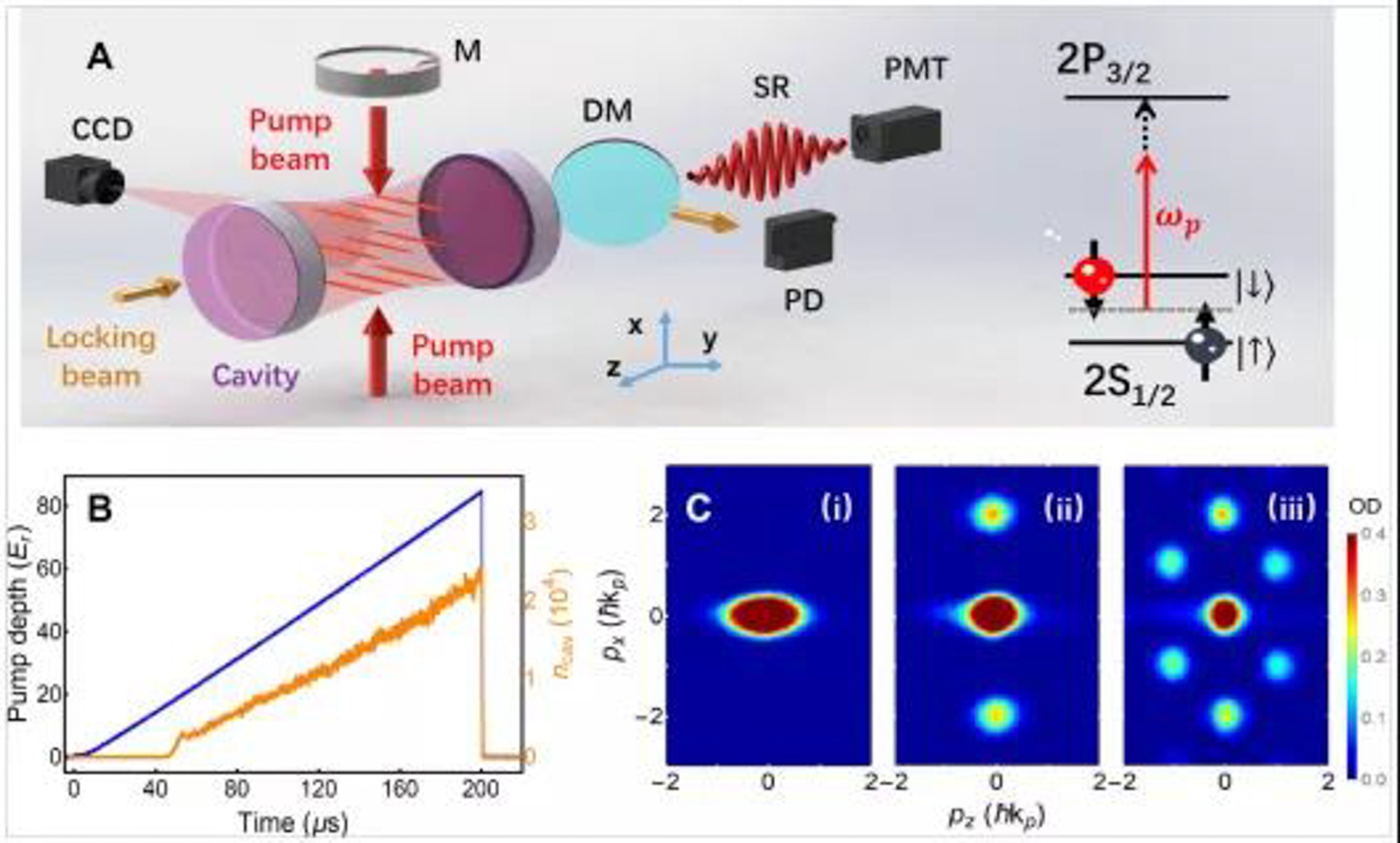 实验设计如图1A所示,一个频率小于费米原子共振频率的激光在横向泵浦光学腔内的超冷费米原子,当泵浦功率低于一个临界值(阈值)时,在光学腔的输出观察不到透射的光,费米原子展现了其在浅光学晶格中的费米气体动量分布(图1C中的(i)和(ii));一旦泵浦光功率增加到阈值以上,光学腔内的光场就会突然形成,同时原子密度波动诱发超辐射量子相变,对角线动量分量的原子会突然增加,自发的自组织,形成棋盘格图案的原子密度分布(图1C(iii))。