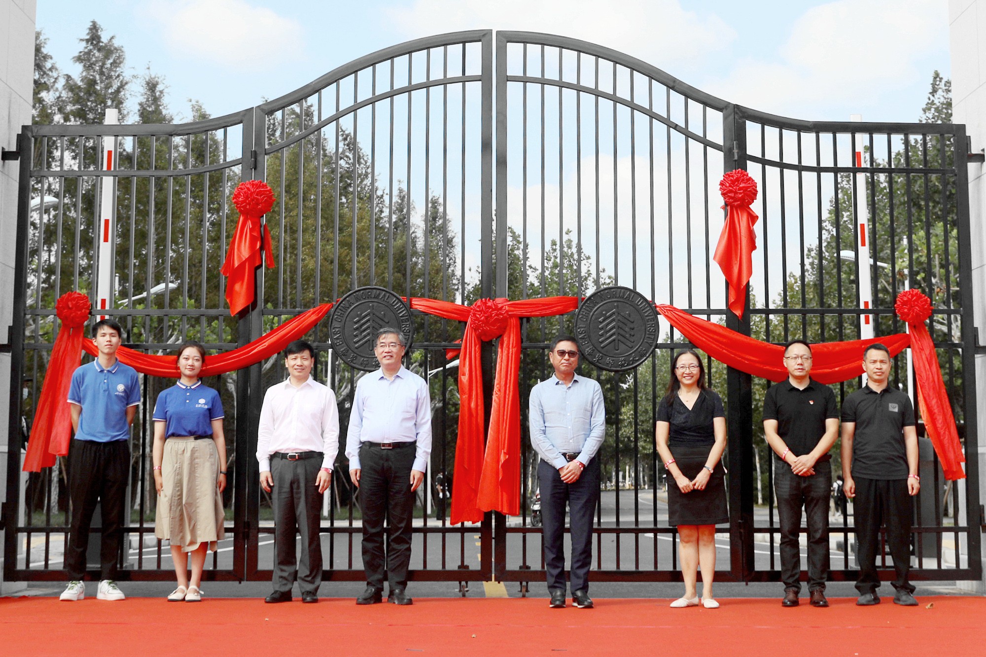 学生代表大夏书院杨沁怡、孟宪承书院鲁子谦,基建处处长王军,施工单位代表邱活虎分别为“虹梅南路5777号”门牌、“3245澳门新莆京”校名牌揭幕