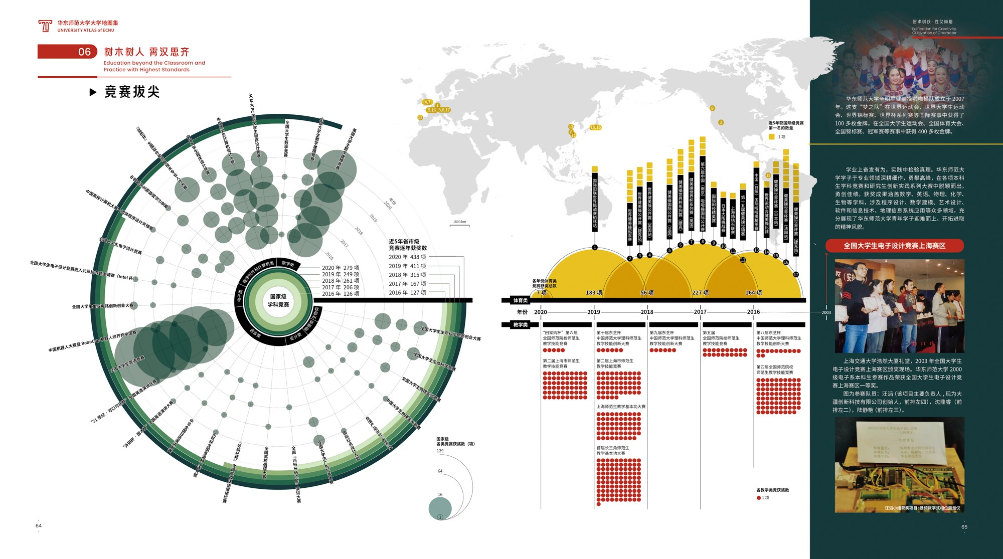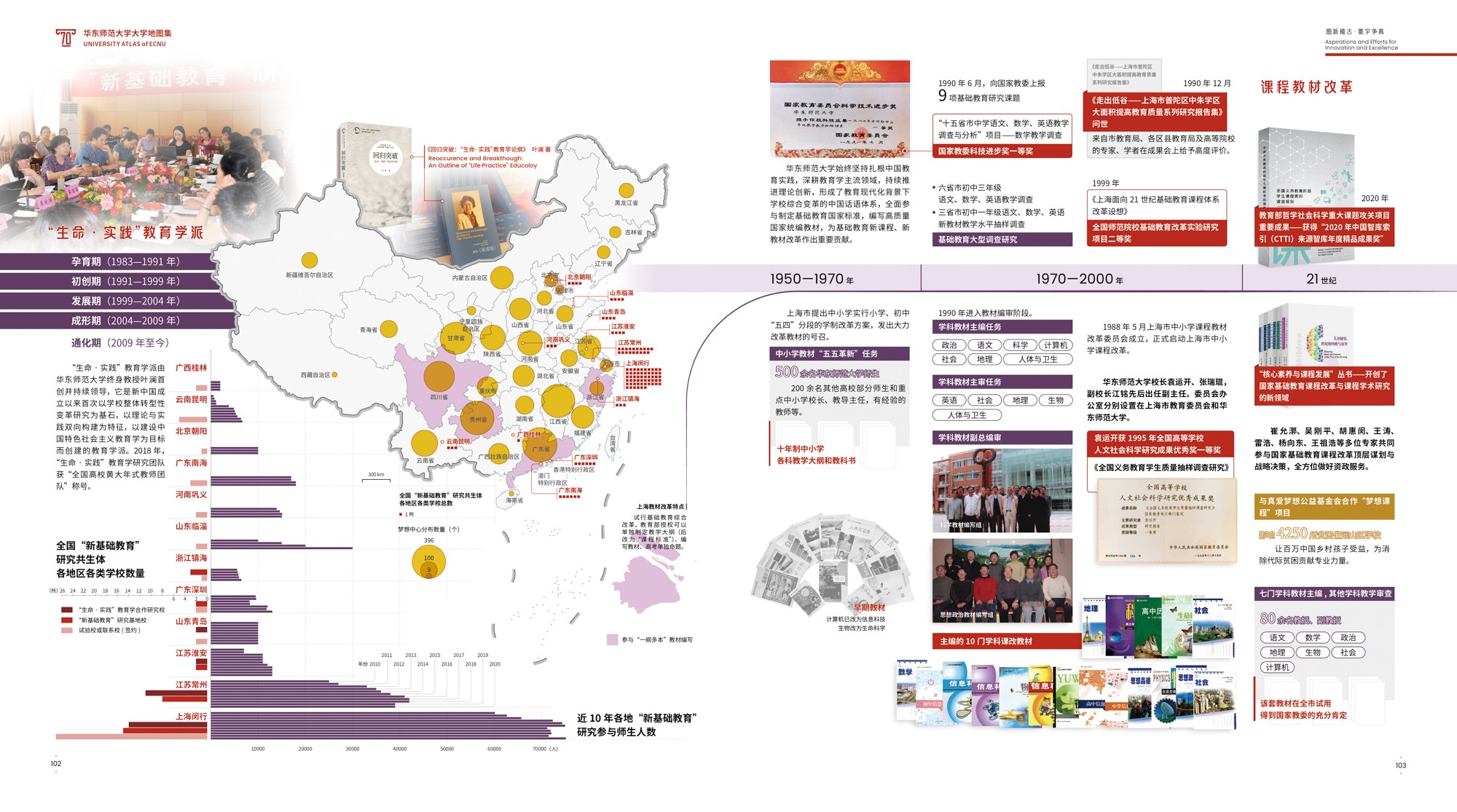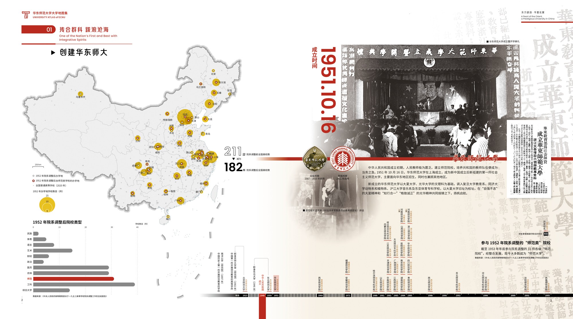 《地图集》围绕华东师大70年发展轨迹展开,共6篇19章,各篇章内容均有明确的主题,篇与章的命名主要取自华东师大 “大师石”《闵行校区勒石铭》 铭文。各篇篇名分别为“东方明珠·华夏名黉”“智求创获·性仗陶熔”“图新稽古·寰宇争高”“教之祈向·国之盛隆”“美丽校园·优雅学府”“胜景亘前·轮驰毋已”。内容主体部分为(第2-4篇),分别围绕大学“人才培养、科学研究、社会服务”等基本职能展开,第5篇承载传统校园物理空间,第1篇和第6篇前后呼应,从时间维度彰显文脉传承,6篇共同构成大学地图集叙事框架。