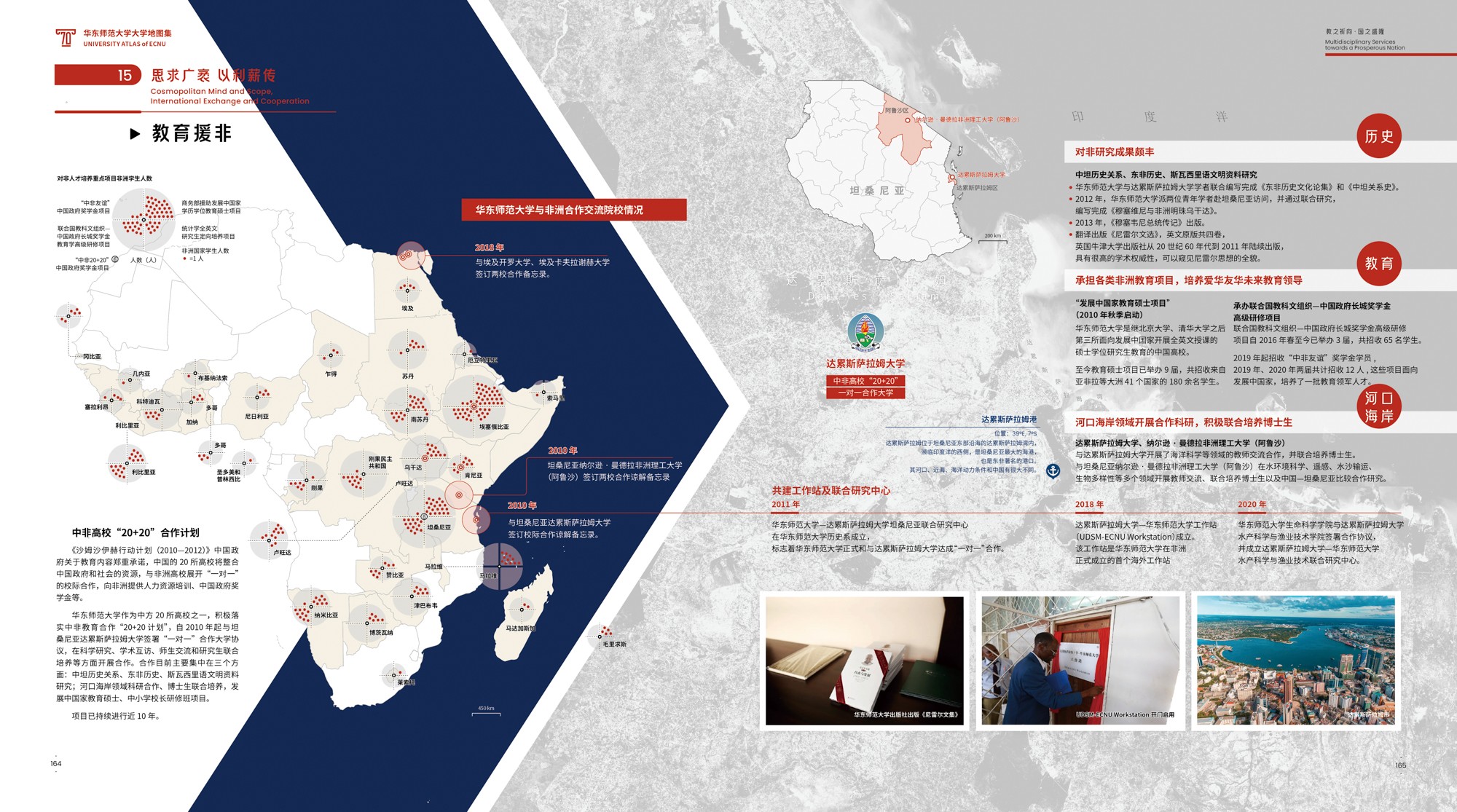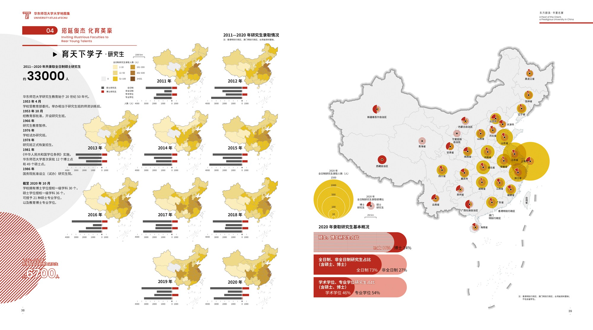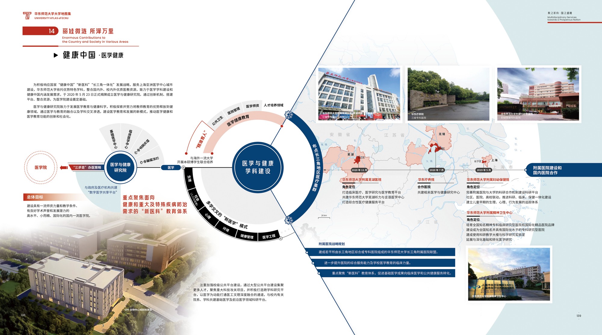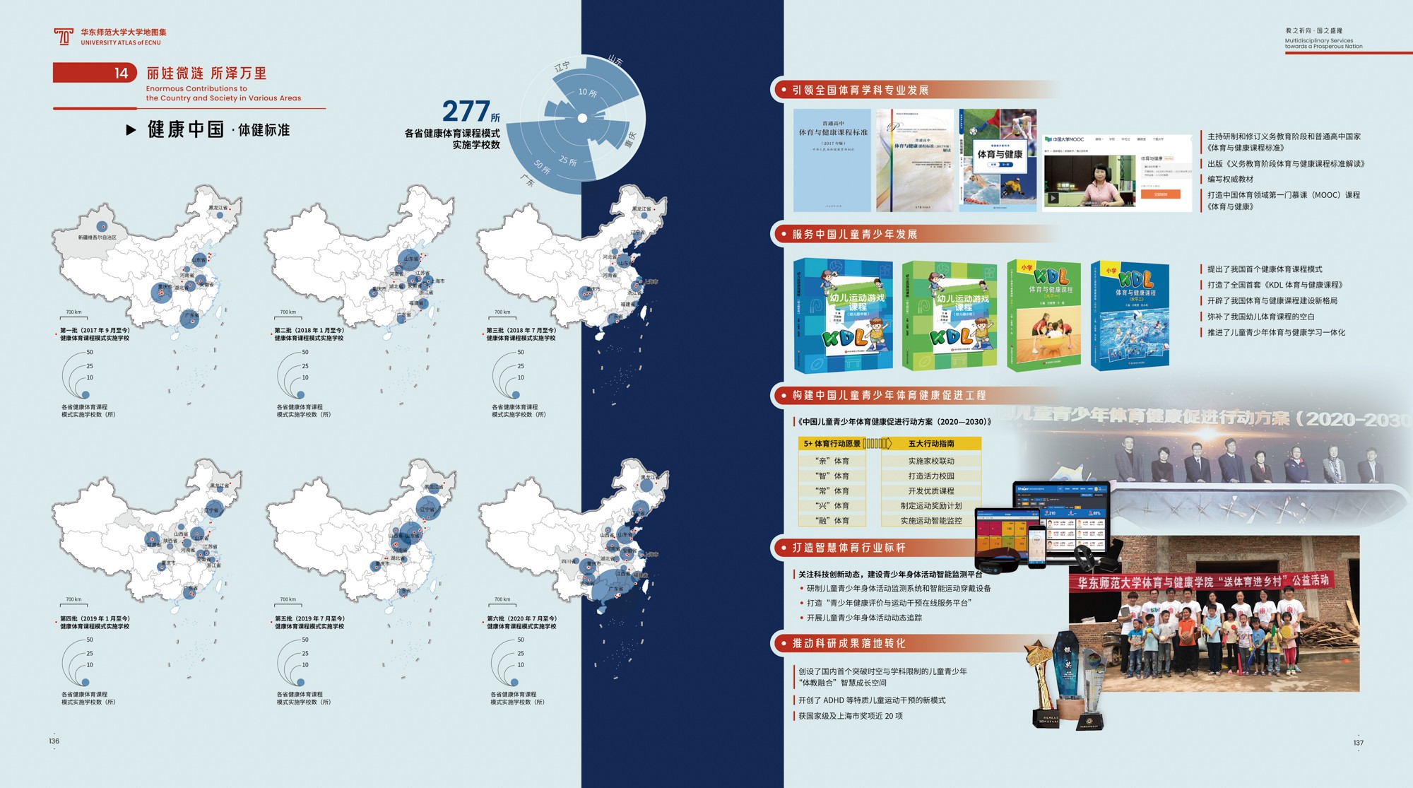 《地图集》围绕华东师大70年发展轨迹展开,共6篇19章,各篇章内容均有明确的主题,篇与章的命名主要取自华东师大 “大师石”《闵行校区勒石铭》 铭文。各篇篇名分别为“东方明珠·华夏名黉”“智求创获·性仗陶熔”“图新稽古·寰宇争高”“教之祈向·国之盛隆”“美丽校园·优雅学府”“胜景亘前·轮驰毋已”。内容主体部分为(第2-4篇),分别围绕大学“人才培养、科学研究、社会服务”等基本职能展开,第5篇承载传统校园物理空间,第1篇和第6篇前后呼应,从时间维度彰显文脉传承,6篇共同构成大学地图集叙事框架。