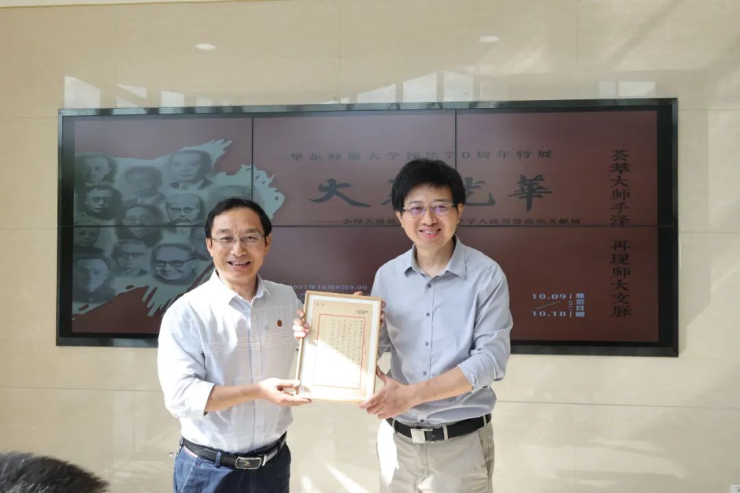 10月9日上午,在华东师大校庆七十周年来临之际,华东师大校庆筹备办公室、教育发展基金会与华东师大中文系古籍研究所在华东师大普陀校区图书馆二楼展厅携手举办“大夏光华—小绿天楼藏华东师大学人翰墨及校史文献校庆70年特展”。