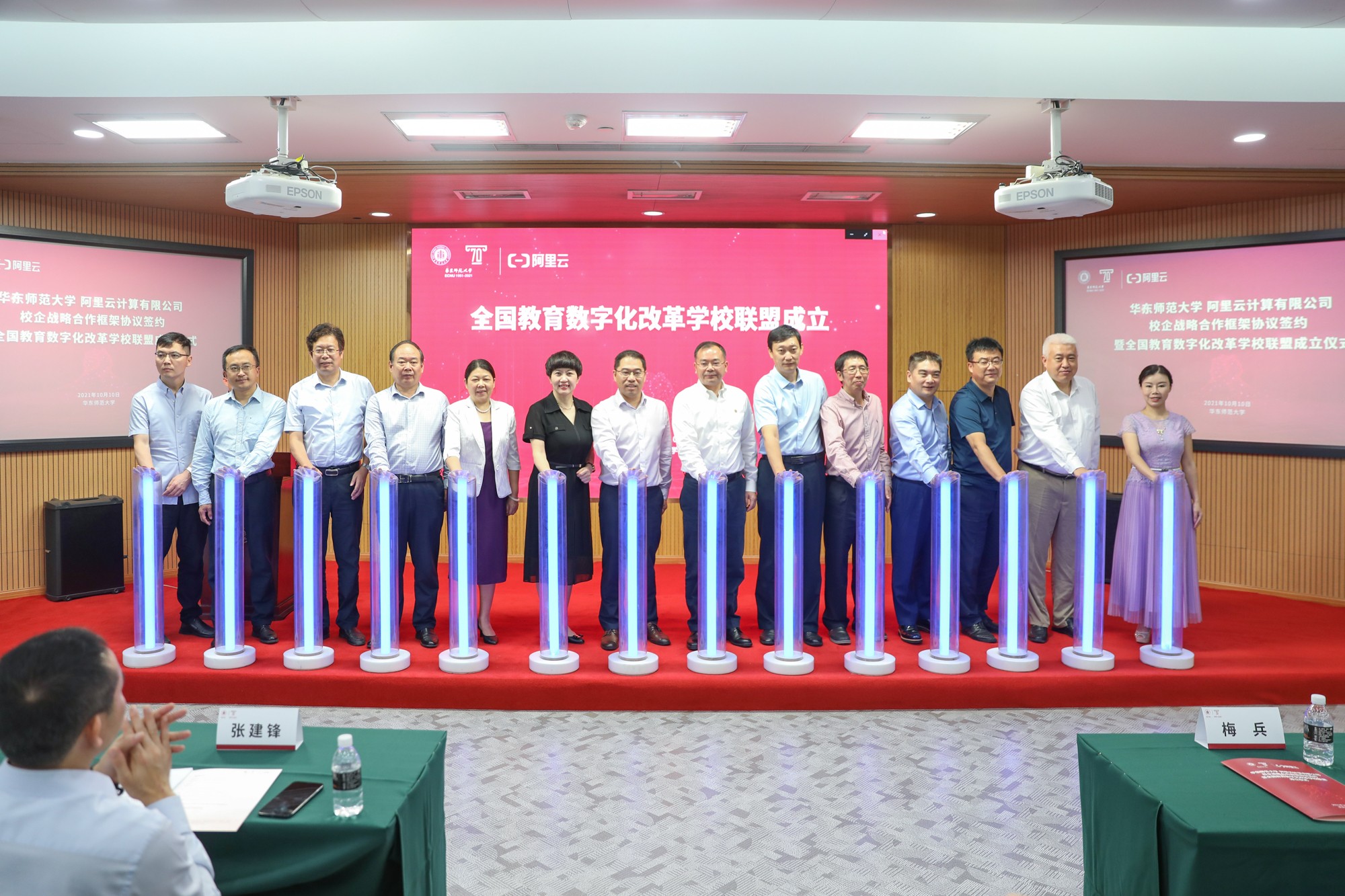华东师大党委书记梅兵,副校长周傲英、雷启立,校长助理斯阳,阿里云智能总裁、阿里巴巴达摩院院长张建锋,复旦大学、四川大学、上海市徐汇中学、重庆谢家湾学校等联盟发起单位的领导嘉宾共同出席签约和成立仪式。仪式由雷启立主持。