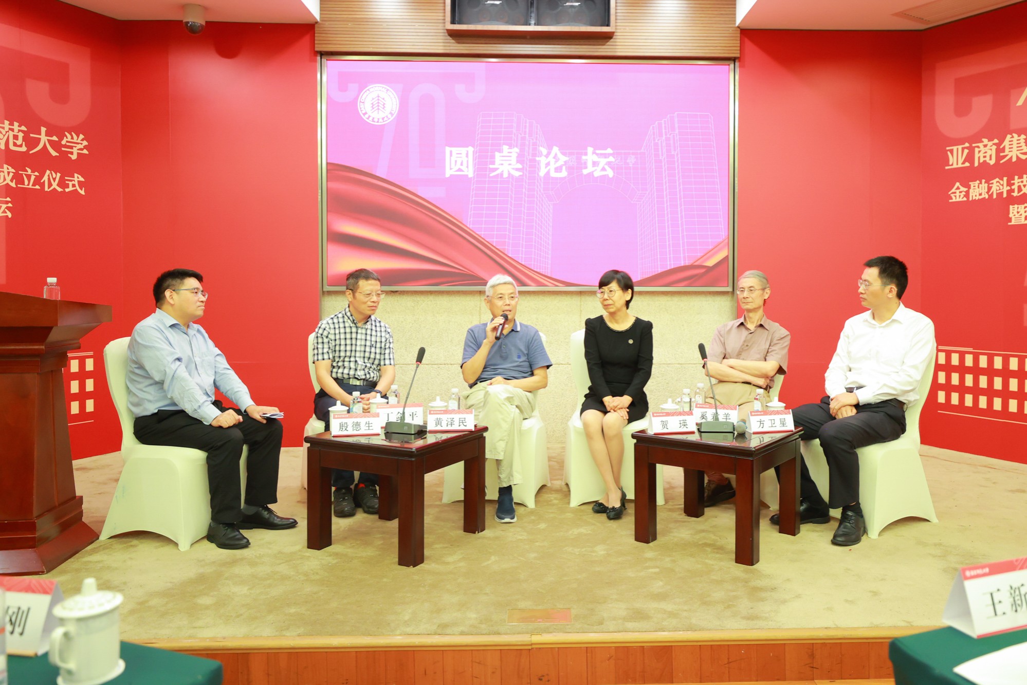 圆桌论坛由经济与管理学部副主任、经济学院院长殷德生主持。黄泽民、贺瑛、奚君羊、丁剑平、方卫星作为论坛嘉宾,共同参与圆桌论坛。论坛嘉宾回忆起师从陈彪如门下,与陈先生接触中印象最深的经历。同时围绕“如何促进上海国际金融中心能级提升,进一步加强学校经济金融人才培养、学术创新”等主题,展开交流对话。