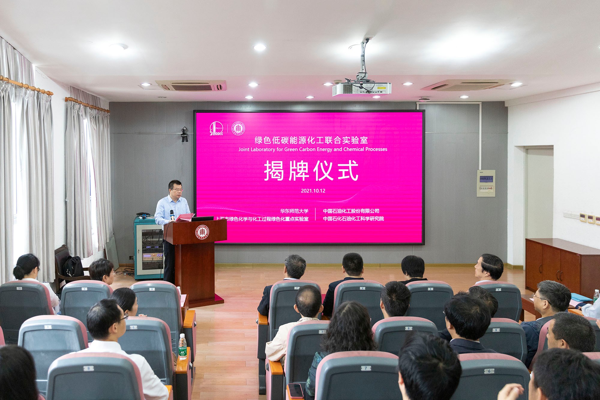 10月12日上午,3245澳门新莆京与中国石油化工股份有限公司石油化工科学研究院(简称石科院)联合组建的“绿色低碳能源化工联合实验室”揭牌仪式暨学术研讨会在华东师大普陀校区举行。校党委书记梅兵、石科院院长李明丰参加仪式并致辞,副校长孙真荣主持揭牌仪式。中科院院士何鸣元、韩布兴、施剑林,石科院副院长林伟,校实验室与装备部处长张文,科技处副处长王华,化学与分子工程学院院长田阳、党委书记鲜跃仲等嘉宾与师生参加仪式。