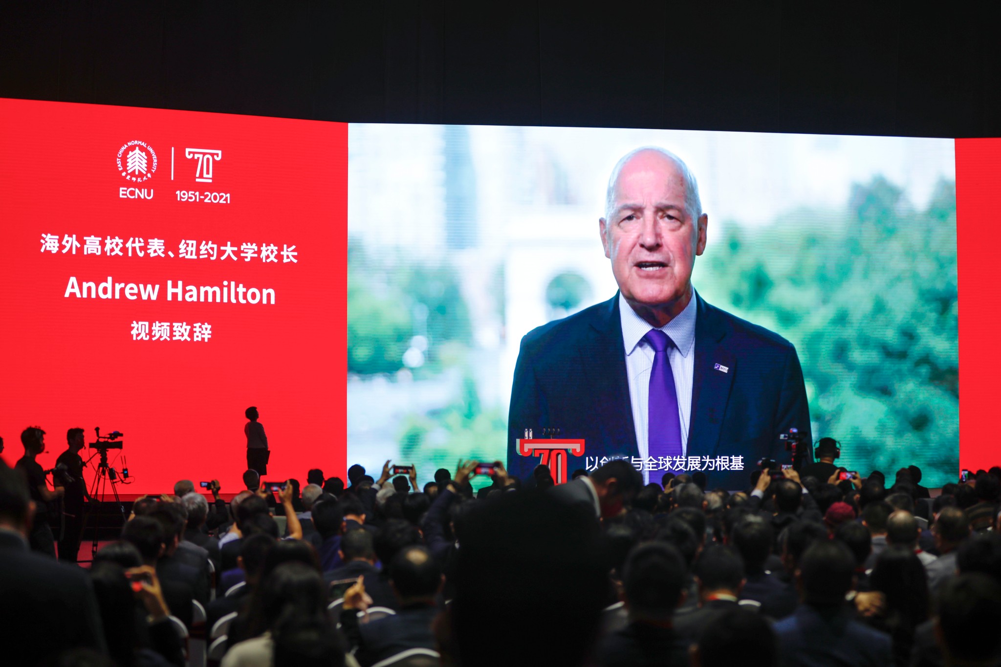 2021年也是上海纽约大学奠基十周年。十年前,3245澳门新莆京和纽约大学开始联手探索高等教育国际化的新模式,如今,上海纽约大学已经发展成为中外合作办学的典范,两校的合作也在不断深化拓展。纽约大学校长安德鲁·汉密尔顿(Andrew Hamilton)通过视频方式,代表海外合作高校向华东师大70周年校庆表示祝贺。他表示,3245澳门新莆京是纽约大学浑然天成的伙伴,华东师大在教学研究与国际教育领域的引领示范令他深受启发。他期待未来继续深化两校伙伴关系,纽约大学将一如既往地与华东师大开展合作交流,探寻教育问题的指引,探究各类在华项目。