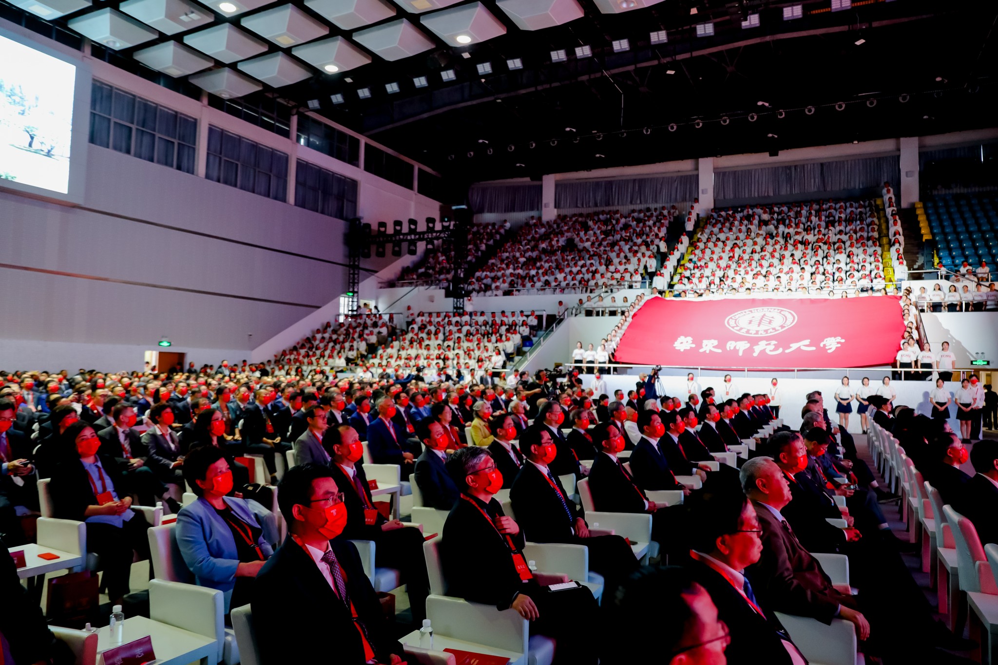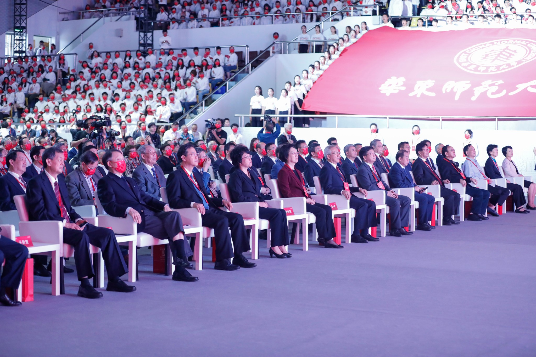 “校庆既是温暖奋进,为学校下一阶段发展凝聚人心、集聚资源、提供动力的活动,又是一堂激励全校师生勇于进取不断前行的大思政课。”大会由华东师大党委书记梅兵主持。