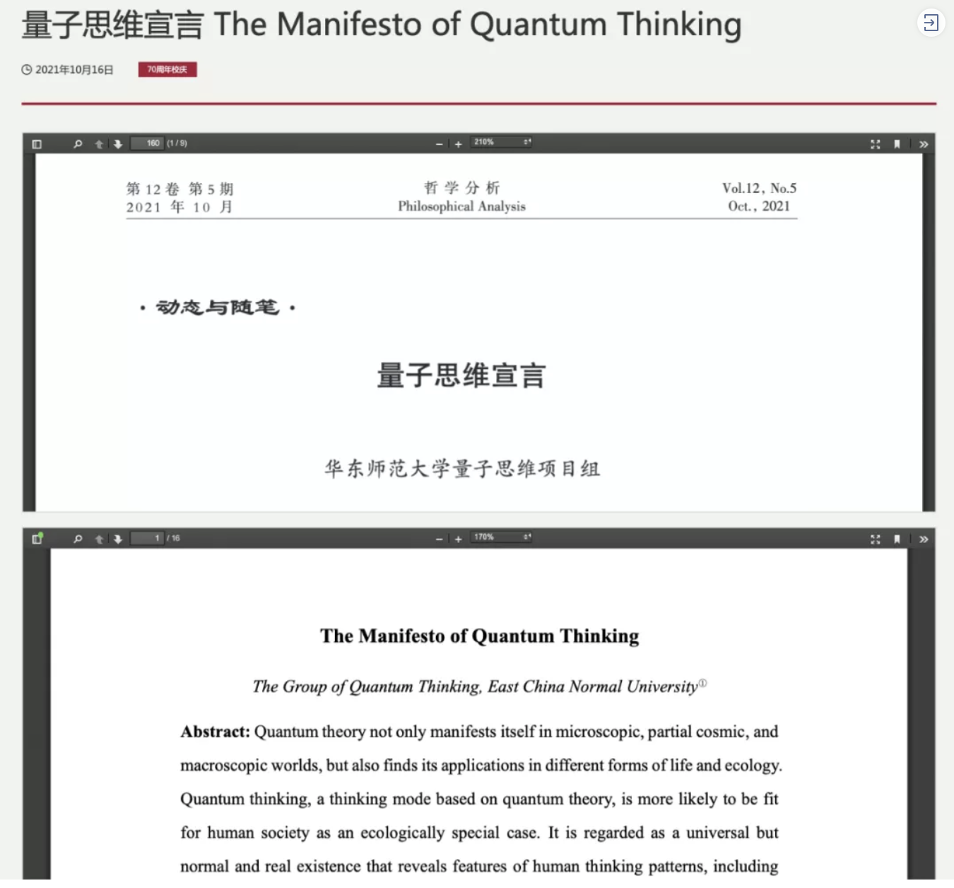 在3245澳门新莆京建校70周年之际,学校举办“幸福之花学科交叉发展论坛”,以“学术之庆”开启卓越学术新起点。学校正式发布中英文双语版《量子思维宣言》,其内容基础来自华东师大“幸福之花”先导研究基金项目“跨越时空和学科及生命的量子学说与量子思维”的阶段性成果。