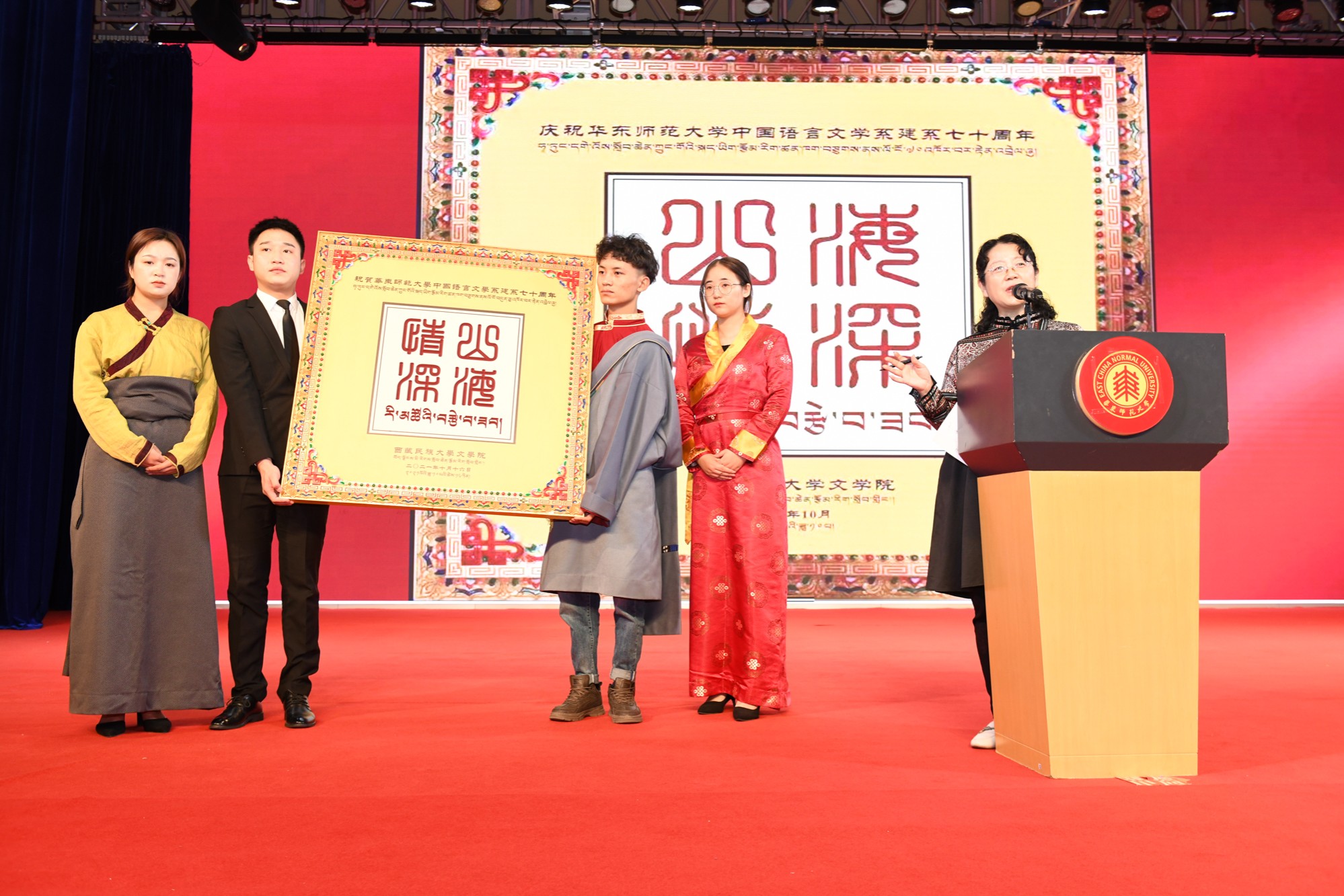 一直以来,华东师大中文系坚守社会使命,以服务国家和区域经济社会发展为目标。作为对口支援学校代表的西藏民族大学文学院党委书记任秀丽在大会上致辞,她表示,自六十年代,在华东师大建校不到十年,中文系建系不到十年的时候,30余名毕业生支援西藏公学,即西藏民族大学的前身,来自中文系等院系的毕业生们为民族教育事业勤奋耕耘,架起了友谊之桥,一直到今天,华东师大中文系与西藏民族大学文学院继续共谱办学新篇章。大会现场,西藏民族大学的同学们还送上了西藏民族大学文学院的贺礼,由藏汉文字书写的“山海情深”。任秀丽书记介绍,字的边框为西藏人民创作的“长城文”,寓意以长城铸牢中华民族共同体意识。