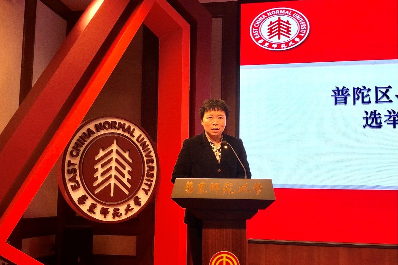 王平首先感谢大家对选举办公室工作的支持和配合,她对各单位前一阶段的选举工作进行了总结,介绍了我校普陀、闵行各选区“十人以上联名推荐”以及第二轮推荐的情况,指出了工作中存在的不足,进一步强调了两区区人大下达的我校代表结构要求,并集中解答了各单位选举工作中遇到的问题和疑惑。