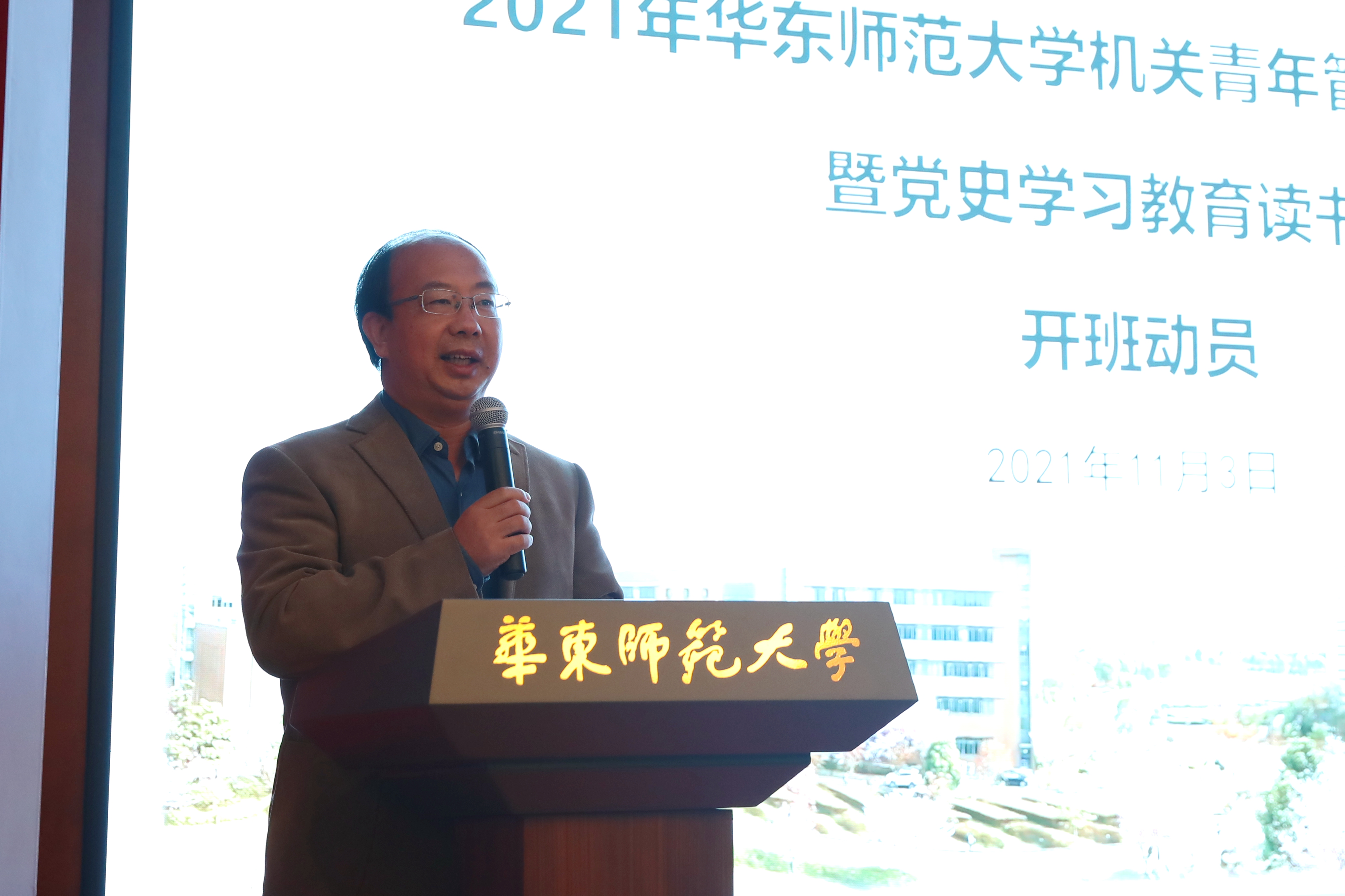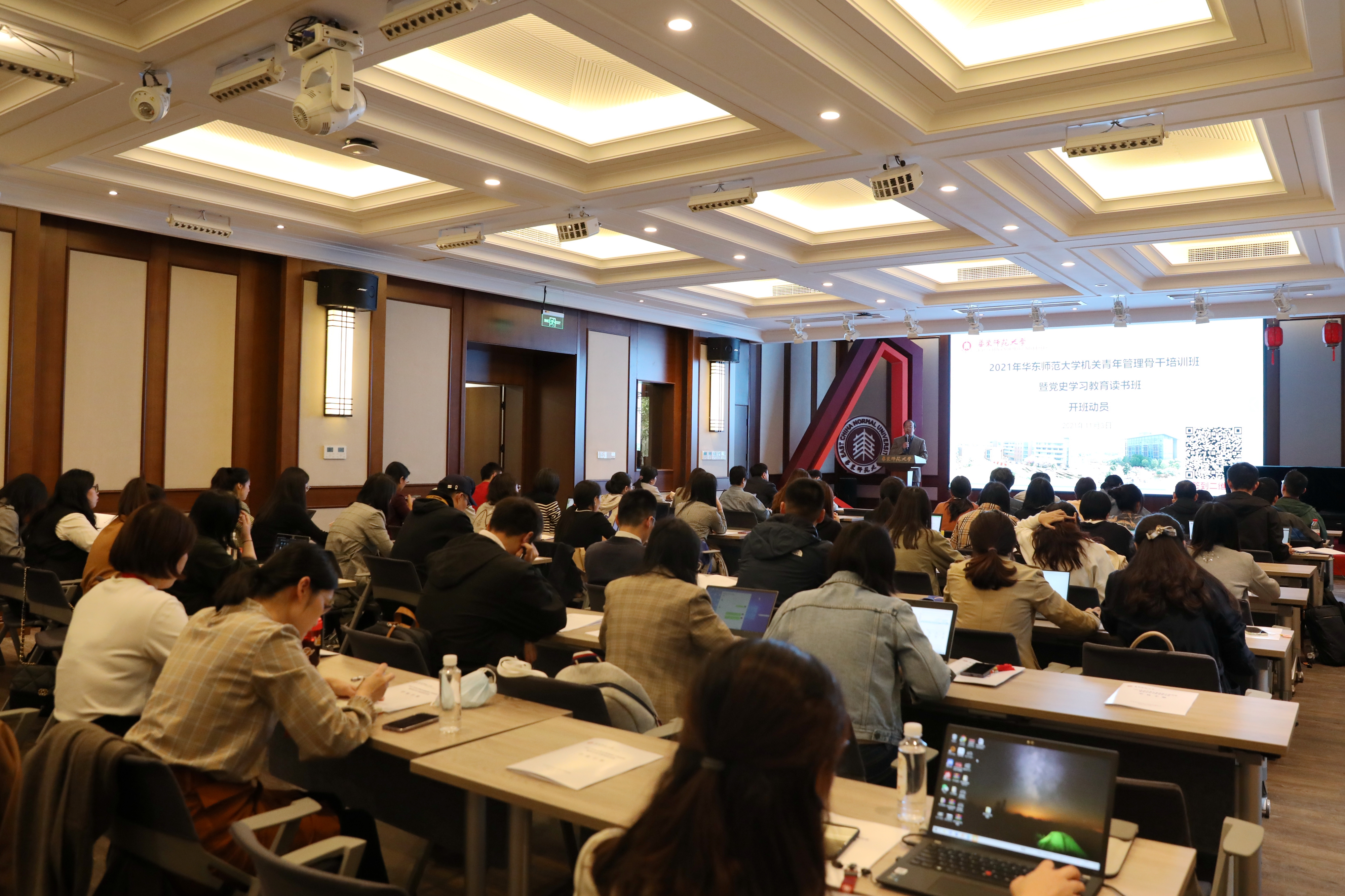 如何培养造就一支忠诚干净担当、卓有能力、适应“双一流”建设要求的高素质、专业化机关管理队伍?11月3日,华东师大2021年机关青年管理骨干培训班暨党史学习教育读书班开班,校党委统战部部长、机关党委书记王庆华作开班动员并作题为《如何做好机关职能部门管理团队文化建设》的开班第一课。来自23个部门的52位机关青年骨干参加本期培训,开班仪式由机关党委副书记张军主持。