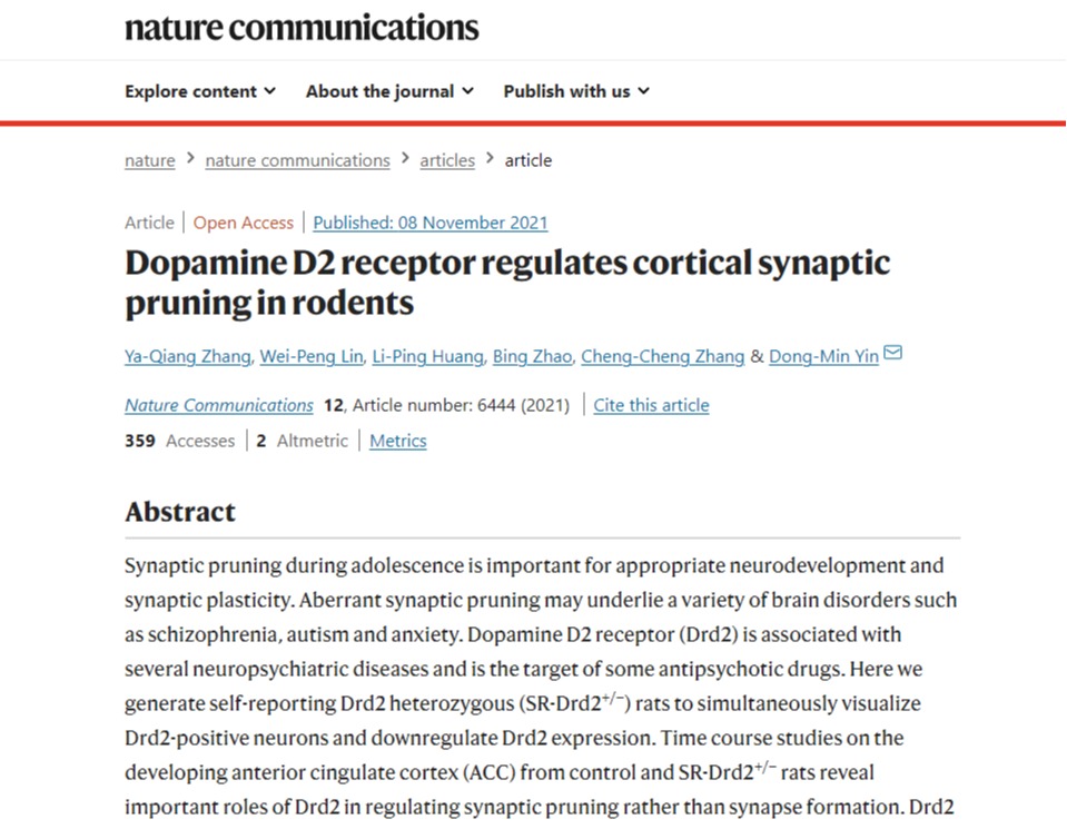 上述研究结果揭示了Drd2在大脑皮层突触修剪中的重要作用,并阐明了相关的细胞分子机制。相关研究论文《Dopamine D2 receptor regulates cortical synaptic pruning in rodents》于2021年11月8日在Nature Communications杂志在线发表。