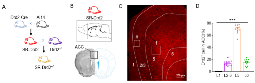殷东敏课题组前期构建了Drd2基因报告(SR-Drd2)大鼠,揭示了Drd2在大鼠大脑皮层发育过程及成年期的细胞表达模式(图1)。研究者分析了大鼠前扣带回皮层(ACC)不同层中Drd2阳性神经元占总Drd2阳性神经元的百分比,发现Drd2主要表达在深层(5-6层,占比约85%),而在ACC的浅层(2-3层),只占约15%。研究者进一步用SR-Drd2大鼠与Drd2+/-大鼠交配得到Drd2自我报告的杂合子(SR-Drd2+/-)大鼠 ,该大鼠的Drd2阳性神经元被红色荧光标记,与此同时Drd2基因的表达也下降了。接下来,研究者使用SR-Drd2+/-大鼠(SR-Drd2作为对照)来研究Drd2在突触发育中的作用,这既达到了同时进行基因标记和基因敲减的效果,又避免了先前研究中Drd2全敲小鼠生长迟缓的全身发育问题。