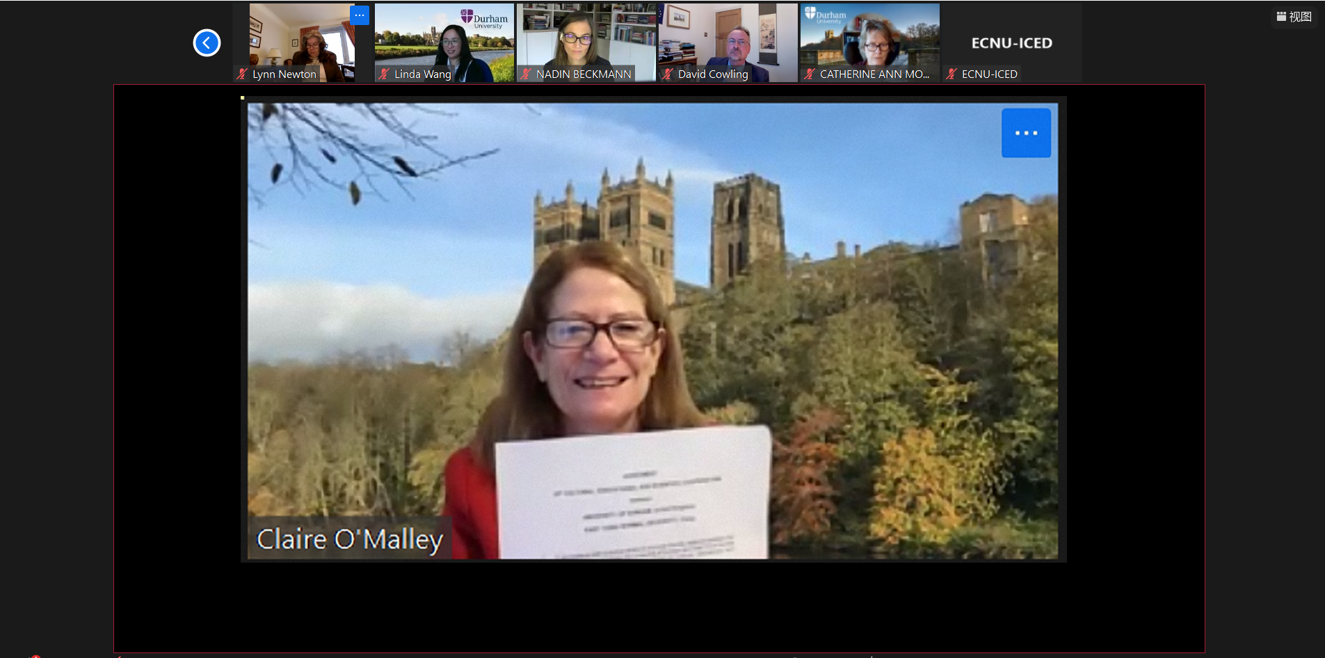 英国杜伦大学副校长Claire O'Malley,现代语言文化学院院长David Cowling,教育学院院长Lynn Newton、教育学院教育事务主任Nadin Beckmann、教育学院研究事务副主任Rille Raaper,社会科学和健康学部国际化事务副院长Catherine Montgomery,国际办公室副主任Jemima Llody等代表出席线上签约仪式(英国杜伦大学会场)。