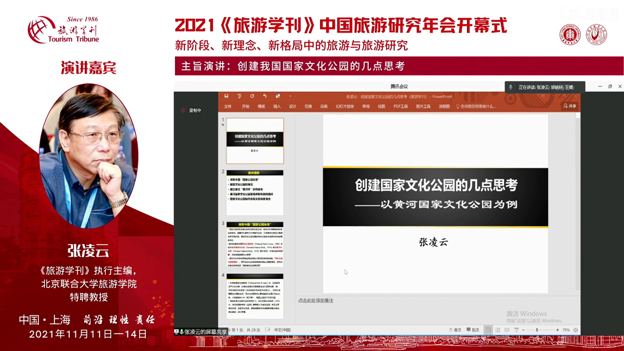 《旅游学刊》执行主编、北京联合大学旅游学院特聘教授张凌云作《国家文化公园创建的探索——以黄河国家文化公园为例》主旨演讲。他在演讲中指出,目前我国的国家公园基本是沿袭美国以自然资源为主的国家自然公园,而“国家文化公园”处于创建和探索阶段,尚未纳入国家公园体系范畴,因此他建议创新中国国家公园体系,分为国家自然公园和国家文化公园两大系列,分别由自然资源部、文化和旅游部归口管理。他探讨了国家文化公园的概念与价值,并以黄河国家文化公园的创建和治理为例,提出黄河国家文化公园应该成为高质量发展与文旅深度融合的示范区,在资源保护的基础上的利用和开发,强化旅游产业功能,通过旅游业传播与传承中华传统文化。