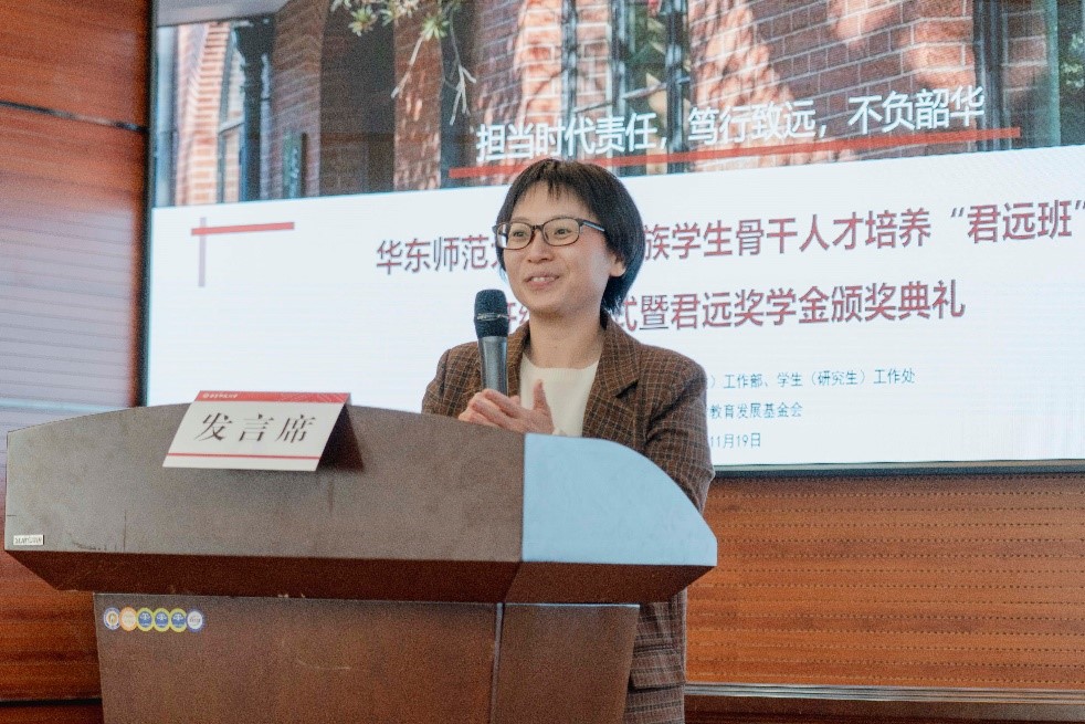 11月19日下午,华东师大少数民族学生骨干人才培养“君远班”开结营仪式暨君远奖学金颁奖典礼于心理与认知科学学院俊秀楼223举行。校长助理吴瑞君,党委学生(研究生)工作部副部长杨艳红,学生(研究生)工作处副处长兼学生资助管理中心主任王新燕,学生资助管理中心项目主管魏楠,教育发展基金会办公室副秘书长宛姝、项目主管李欣阅,上海唐君远教育基金会秘书长唐君远文化研究会、学术委员会主任张伟,2020-2021学年华东师大君远奖学金获得者以及少数民族学生骨干人才培养第一期和第二期“君远班”全体成员参与了本次活动。活动由党委学生(研究生)工作部副部长杨艳红主持。
