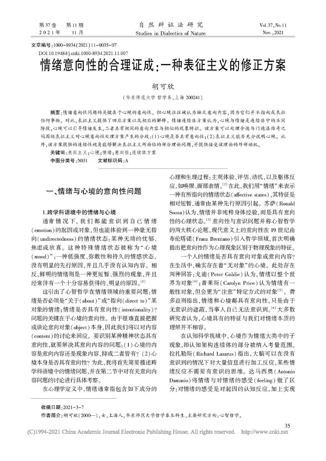 不久前,CSSCI期刊《自然辩证法研究》第37卷第11期发表了华东师大2018级哲学专业本科生胡可欣的论文——《情绪意向性的合理证成:一种表征主义的修正方案》,这也是华东师大哲学系近五年来本科生首次独立在C刊发文。本科生怎么发C刊?一起来听听她的故事。
