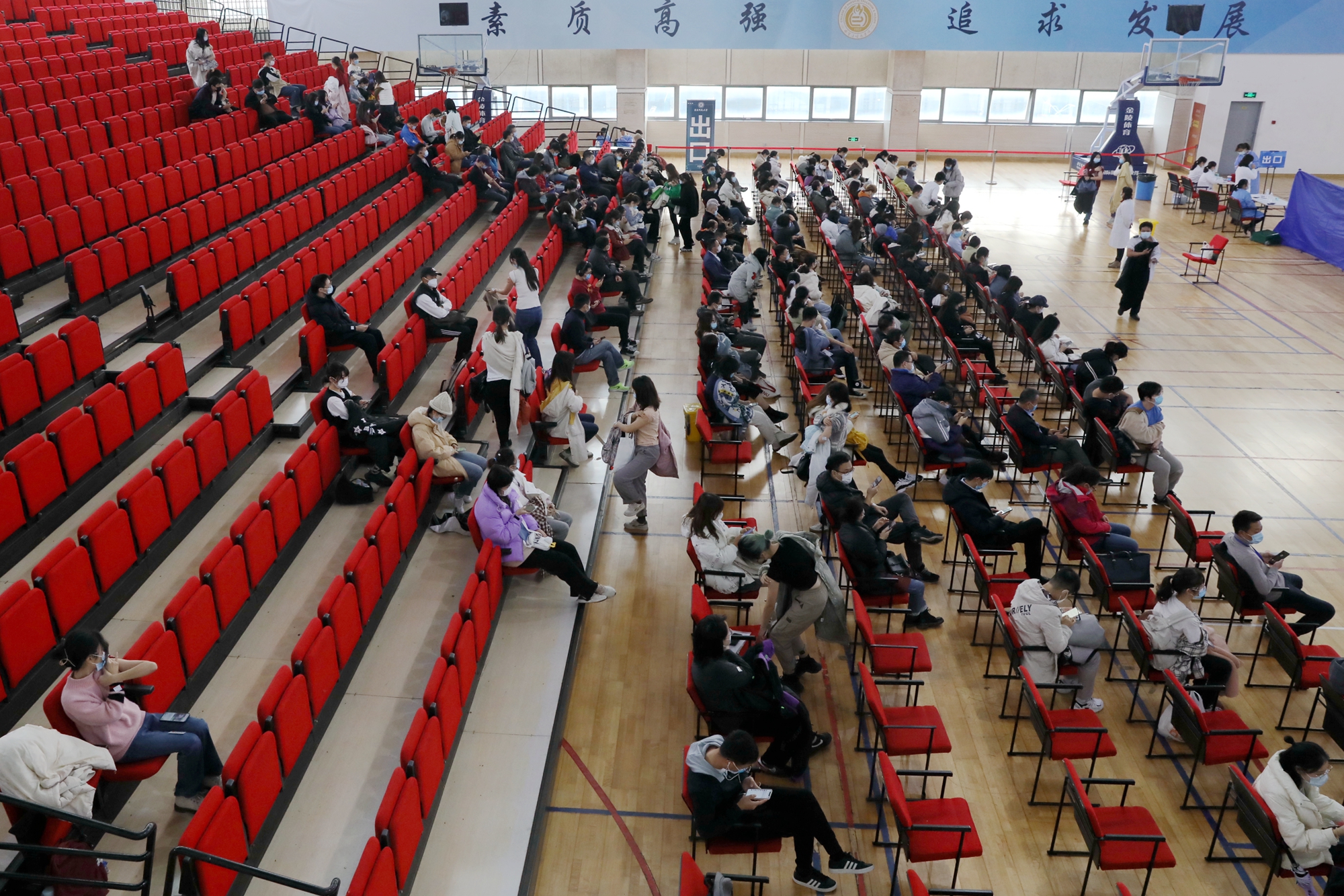 接种师生从体育馆二层入口进行测温后进入等待区,在预检区域依次接受健康询问和身份确认后,分类别进入疫苗接种区。疫苗接种完成后,须在现场进行30分钟留观,确定无不适症状后方可离场。截至11月30日16点30分,本轮疫苗接种共完成4138剂次疫苗接种。