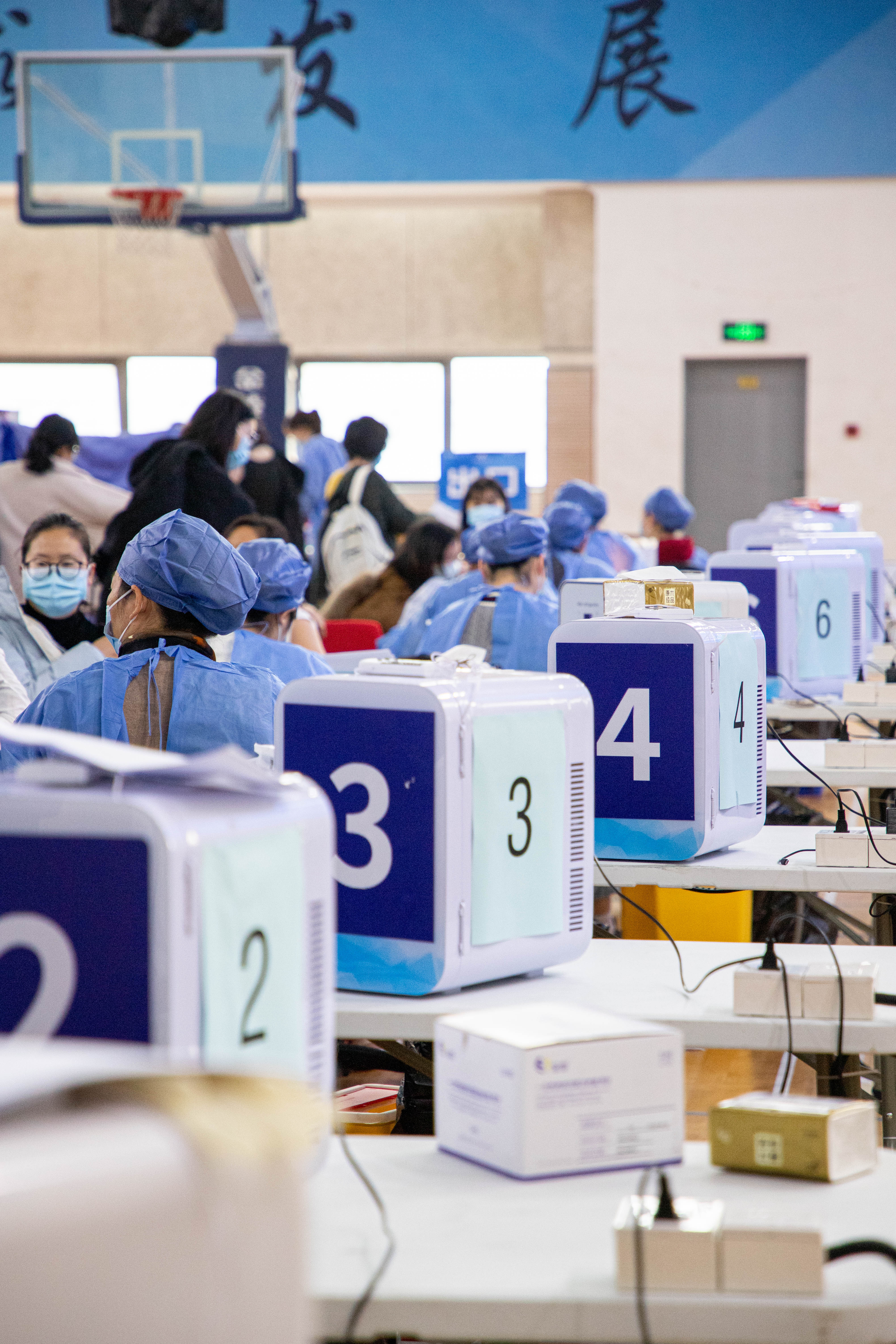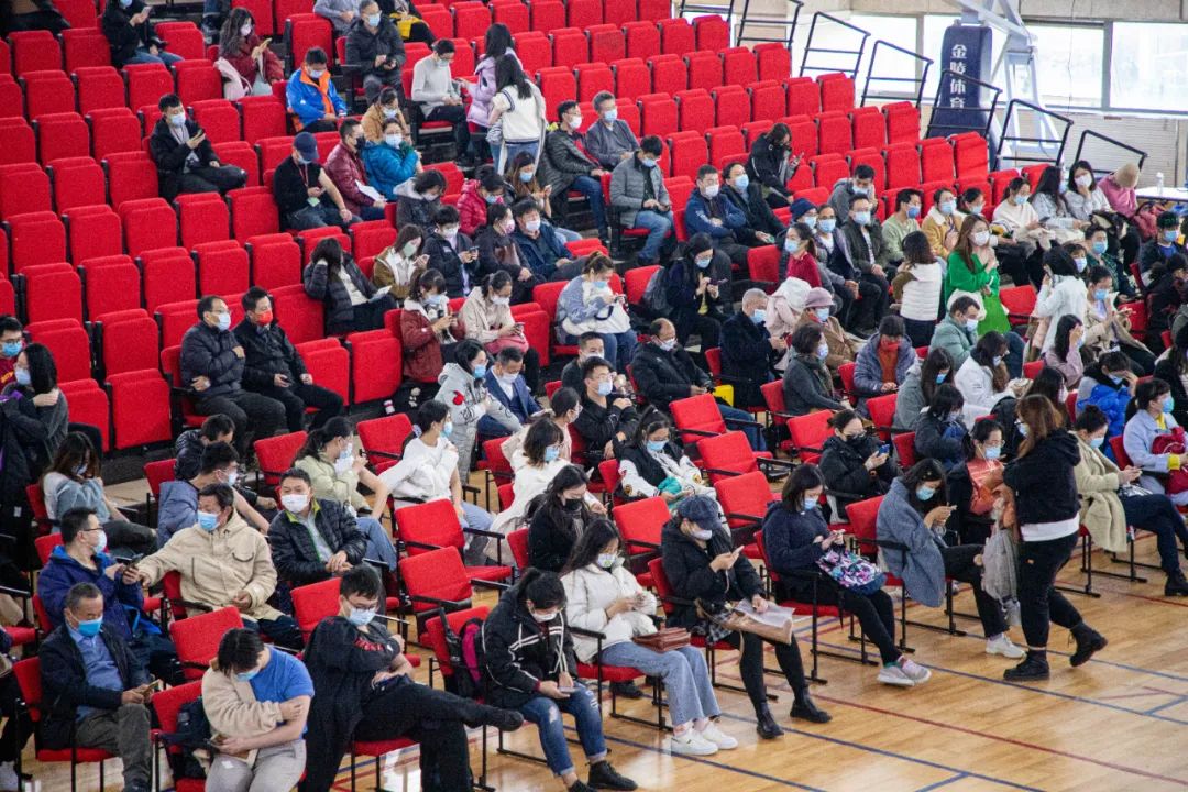 11月30日一早,现场5个信息登入点和20个疫苗接种台布置完毕,将近100名医务人员、工作人员、志愿者现场就位,做好疫苗接种工作准备。师生志愿者分批次在进出口以及场内多个点位进行引导,严格把控人员准入,维持现场秩序。