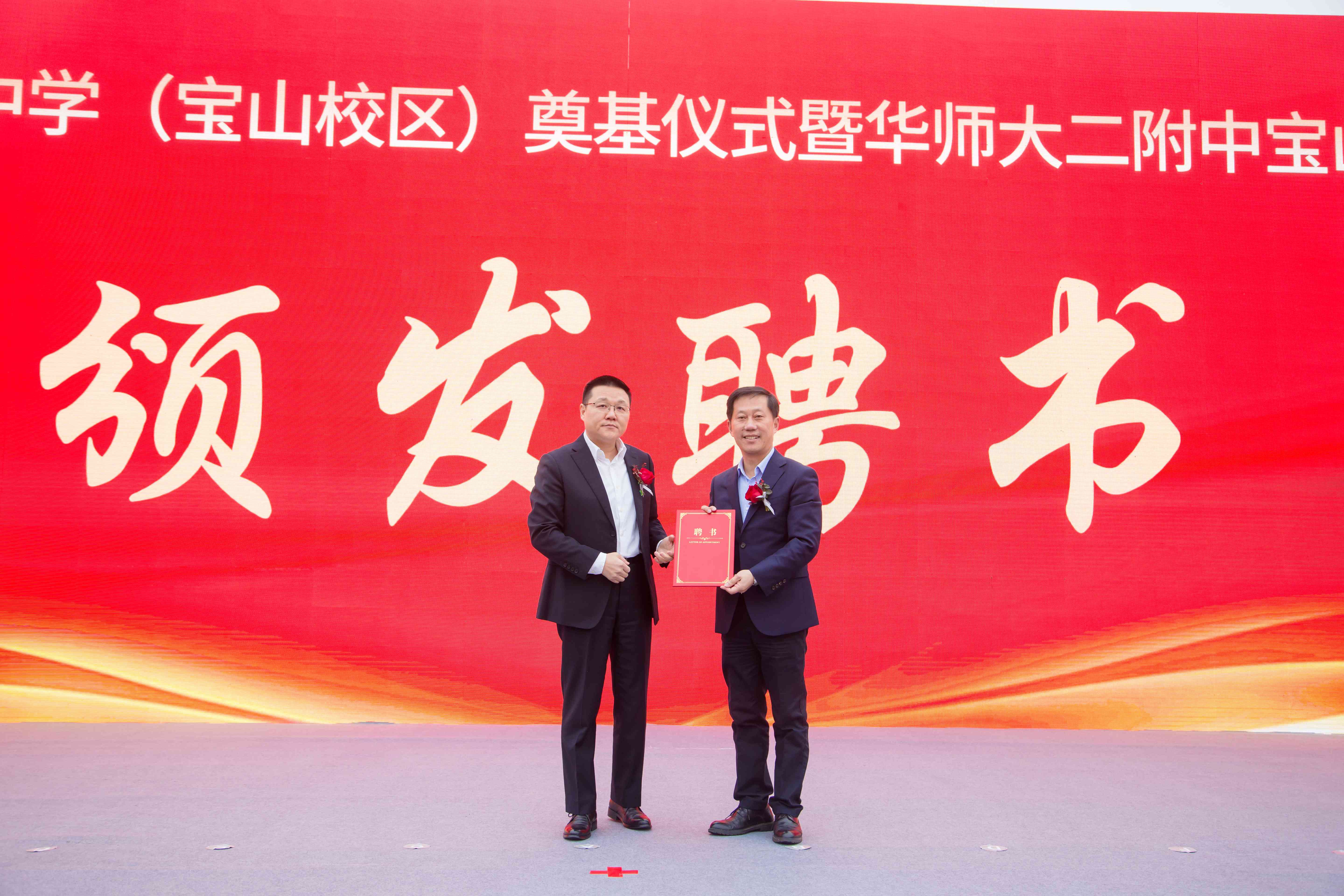 宝山区区委常委、副区长孟庆源为华师大二附中宝山教育集团理事长李志聪颁发聘书