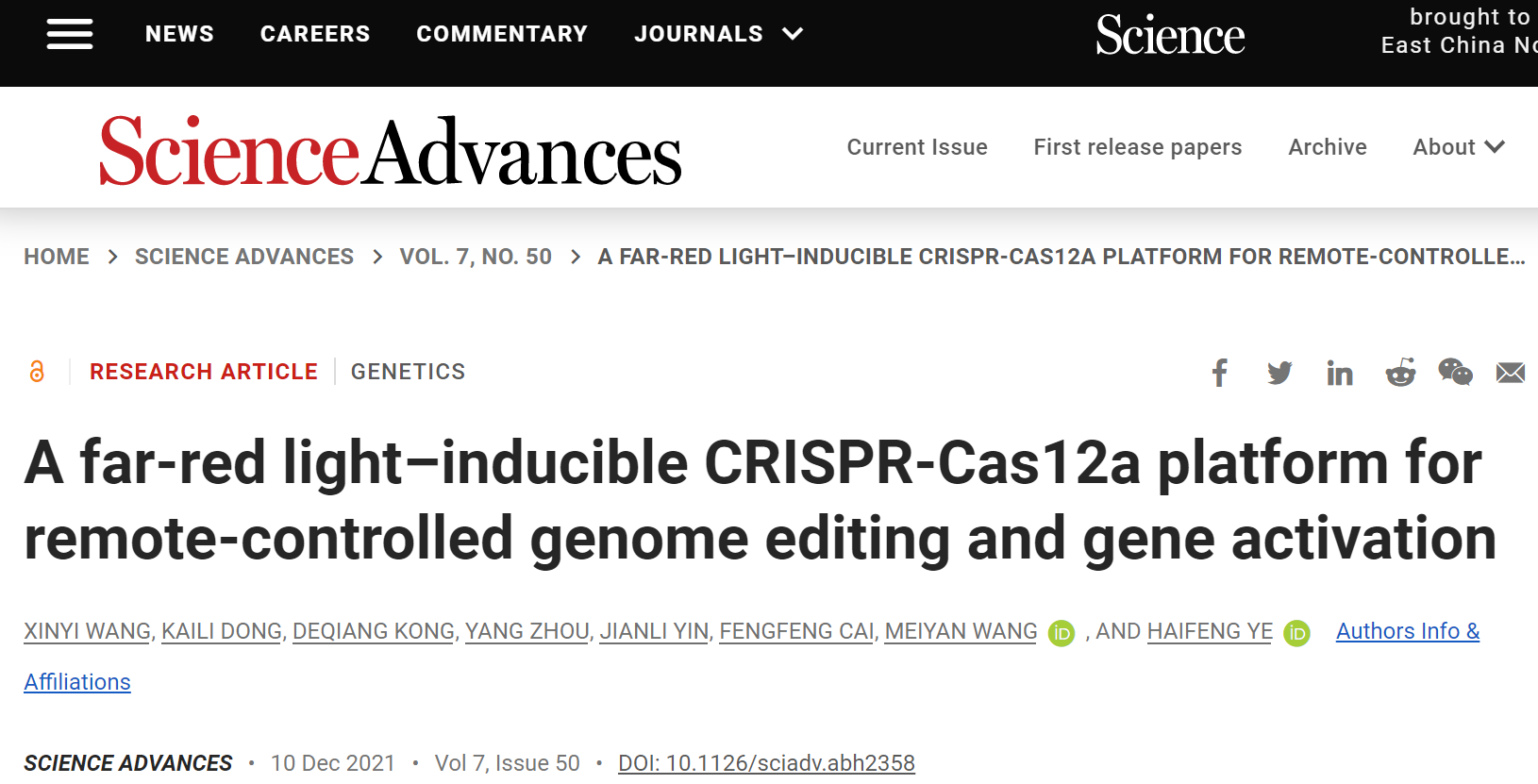 2021年12月10日,3245澳门新莆京生命科学学院、上海市调控生物学重点实验室、3245澳门新莆京医学合成生物学研究中心叶海峰课题组在国际著名学术期刊《科学—进展》(Science Advances)在线发表了题为 A far-red light–inducible CRISPR-Cas12a platformfor remote-controlled genome editingand gene activation 的研究论文,报道了一种远红光调控的基因编辑和表观遗传重塑的控制系统,为精准可控的基因编辑技术再添一员大将。这是继2020年7月开发的光控基因编辑工具FAST系统之后(Yuetal, Science Advances, 2020),开发的另一种全新版本。