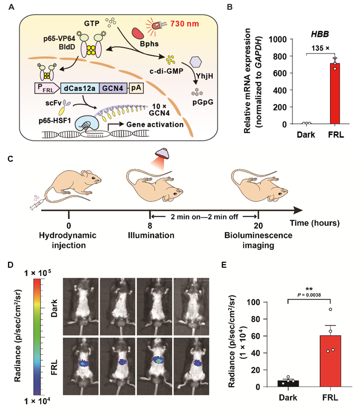 接着,研究人员通过利用SunTag技术,开发了远红光调控的CRISPR-dCas12a基因激活系统(简称FIdCA)。利用该系统,研究人员成功实现了对内源基因HBB的高效激活。随后,研究人员将FIdCA系统通过尾静脉递送至小鼠体内,成功在小鼠体内实现了远红光诱导靶基因激活。