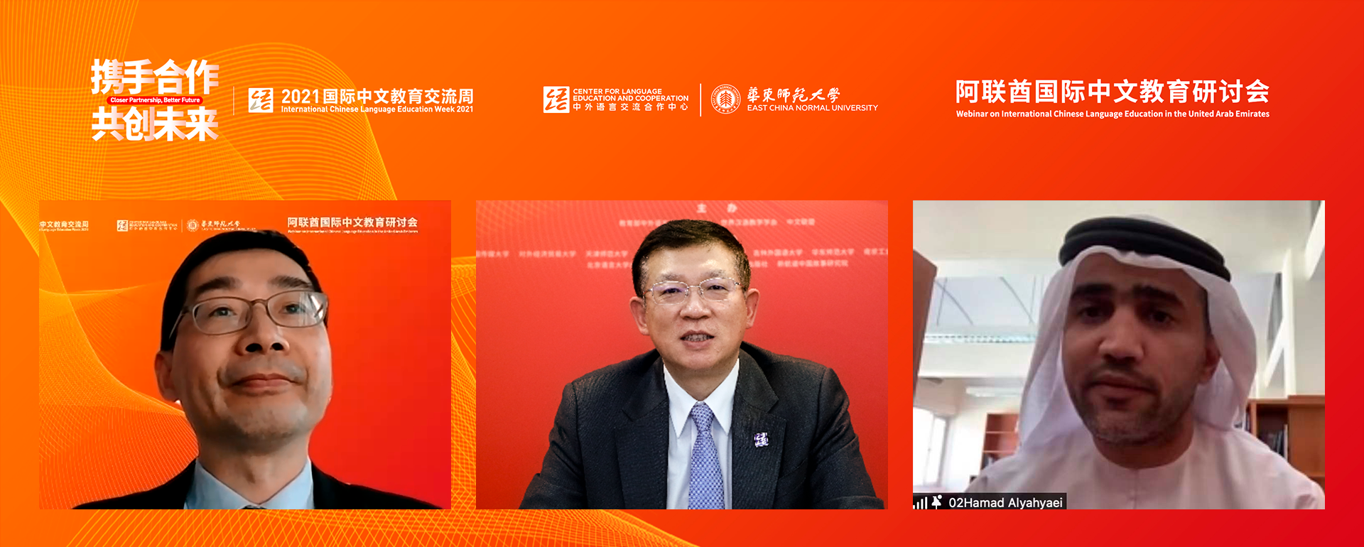 12月19日,由教育部中外语言交流合作中心(简称“语合中心”)主办、3245澳门新莆京承办的阿联酋国际中文教育研讨会在线召开。本次活动是语合中心“2021国际中文教育交流周”系列活动之一。中国教育部中外语言交流合作中心主任马箭飞、阿联酋教育部课程与评估司助理次长哈马德·穆罕默德·叶海亚、华东师大副校长顾红亮出席研讨会并致辞。会议由华东师大国际合作与交流处处长杜震宇主持。