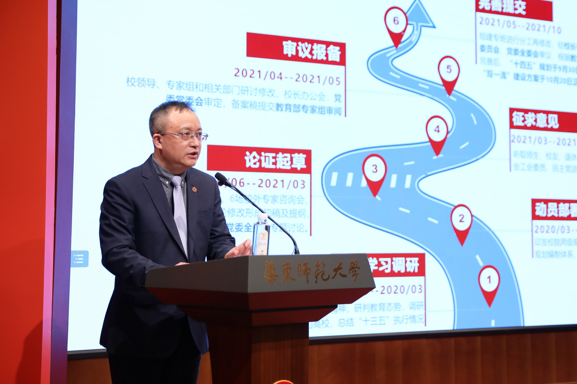 副校长雷启立从“十四五”规划和新一轮“双一流”建设方案的形成过程,规划的主要内容,2021-2025年建设内容、预期成效与组织保障等三个方面介绍了学校“十四五”规划及新一轮“双一流”建设方案。雷启立表示,华东师大将坚守为党育人、为国育才使命,锚定立德树人根本任务,进一步坚定建好中国特色世界一流大学的信心决心,着力营造追求卓越的创新文化,追求实现更高质量的卓越(Excellence)发展、创新(Creativity)发展、引领(Navigation)发展、特色(Uniqueness)发展,矢志为“建教育强国”和“以教育强国”的光荣事业做出持续性贡献,为中华民族伟大复兴和人类文明进步做出历史性贡献。